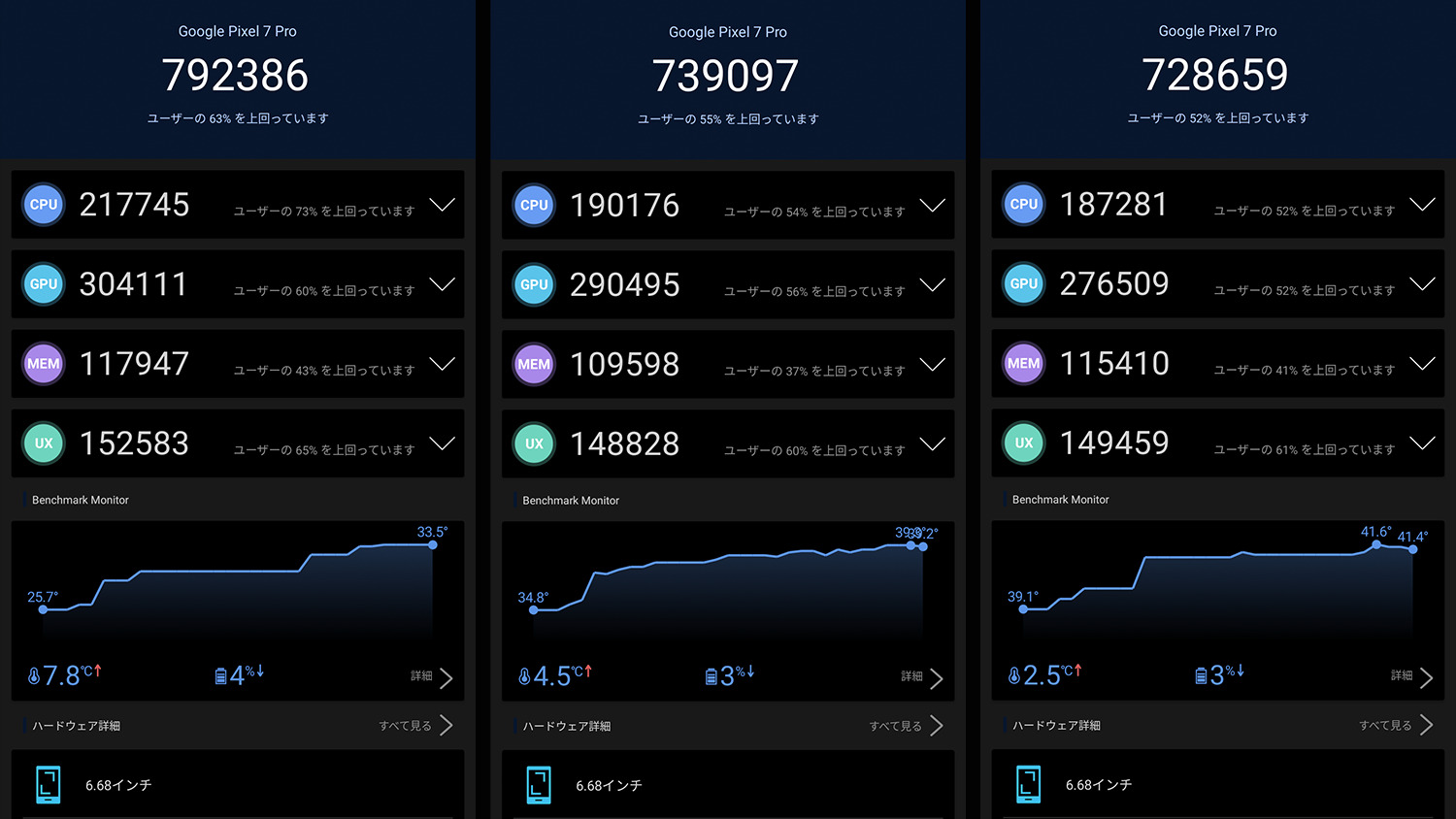 ただ注意点ですがミドルレンジを使っていた人や2021年より前のモデルを使っていた人からすればPixel 7 Proの発熱はびっくりすると思います。ただ近年のハイエンドの中ではマシな印象。