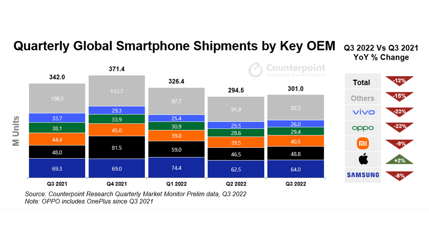 今回市場調査会社であるCounterpoint Researchが2022年第3四半期における市場シェアの最新レポートを公開したことが判明したとしています。まず市場全体で見ると前年対比で12%の減少。