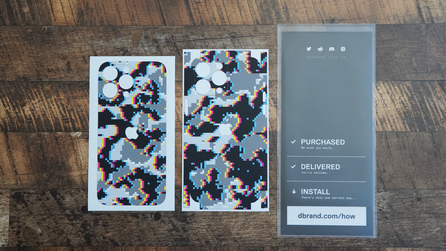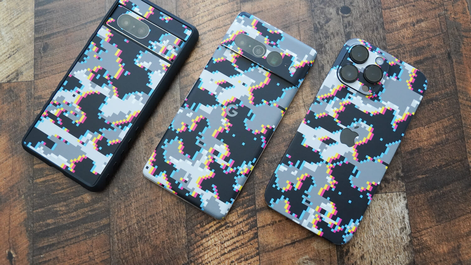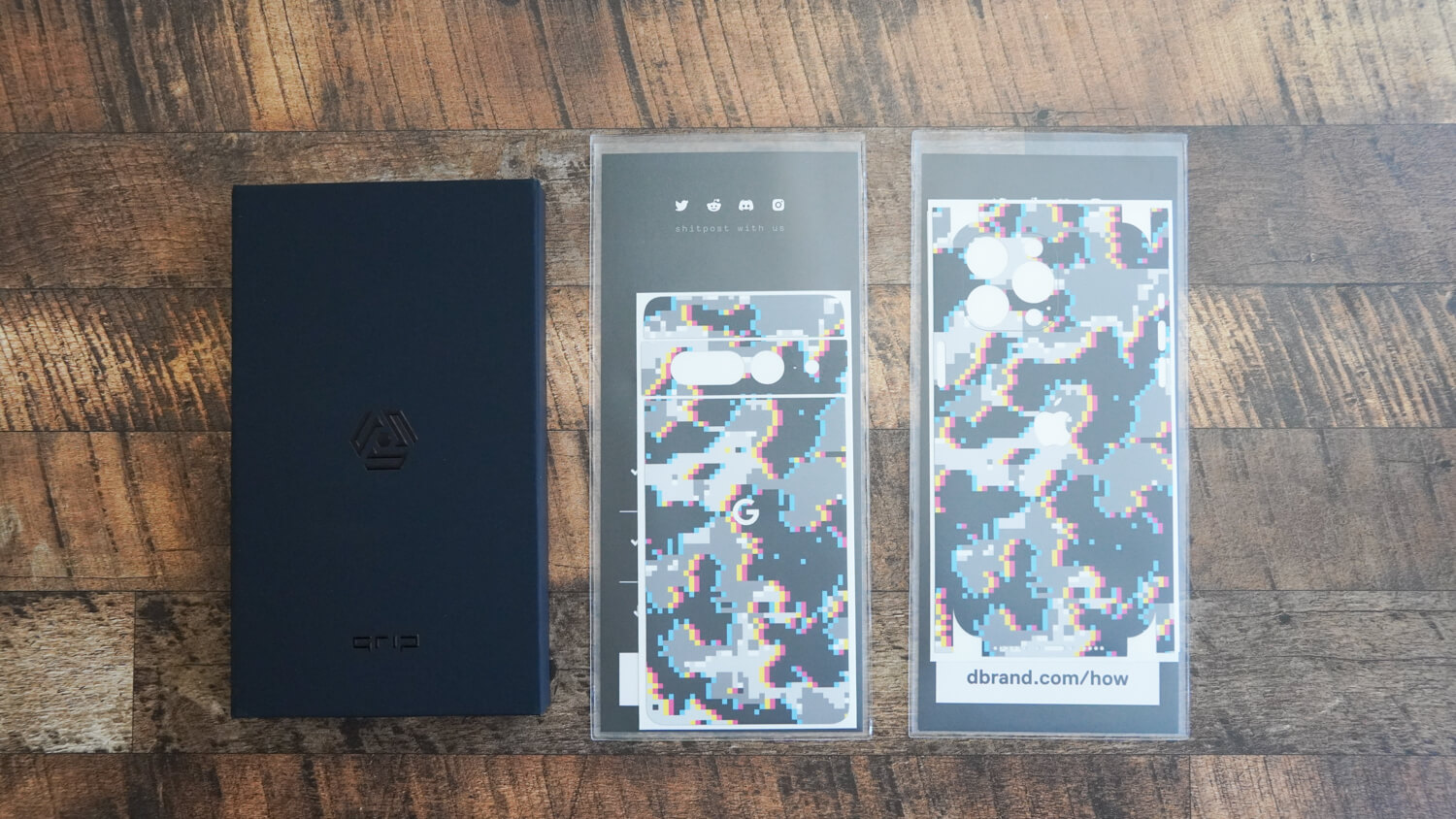 そして今回は外出する際のメンバーを全て同じデザインで統一してみようと思い購入。今回dbrandでiPhone 14 Pro Max/Pixel 7 Pro/Pixel 7用のグリッチ迷彩という柄を購入しました。