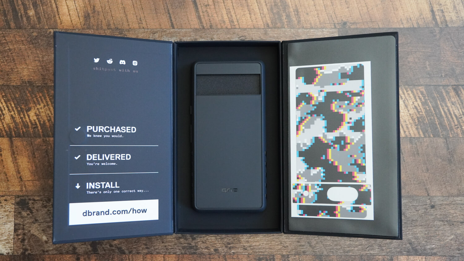 高級感のある化粧箱にケースとシールとすごく単純でケースに今回購入したグリッチ迷彩のシールを貼るだけという感じです。