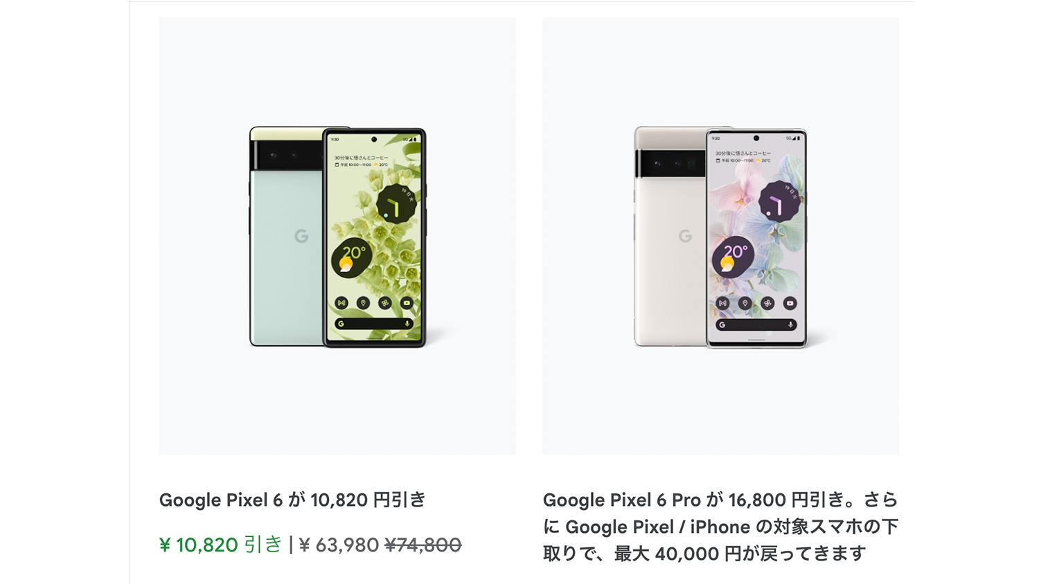 ちなみにですがPixel 6シリーズも値引き対象となっておりPixel 6は1万820円の値引きで6万3980円で購入可能。そしてPixel 6 Proは1万6800円の値引きで9万9800円から購入可能となっています。