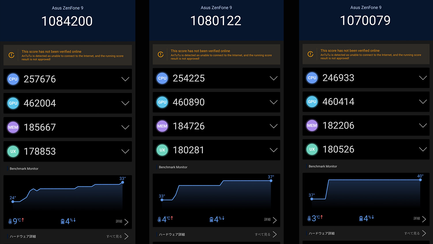 ベンチマークスコアが100万点を超えることよりも3回連続で回してもほとんどスコア変動なし。なので負荷をかけた時のパフォーマンスの持続性がコンパクトモデルの中では優秀。