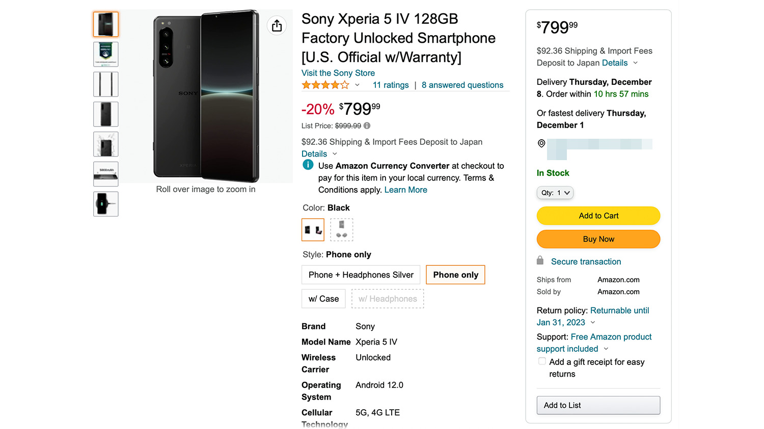 アメリカのAmazonやBest BuyなどでXperia 5Ⅳが$200の値引きになっているとしています。アメリカではWF-1000XM4が購入特典として付属している場合もありますが執筆時点で米Amazonでは品切れの状態。