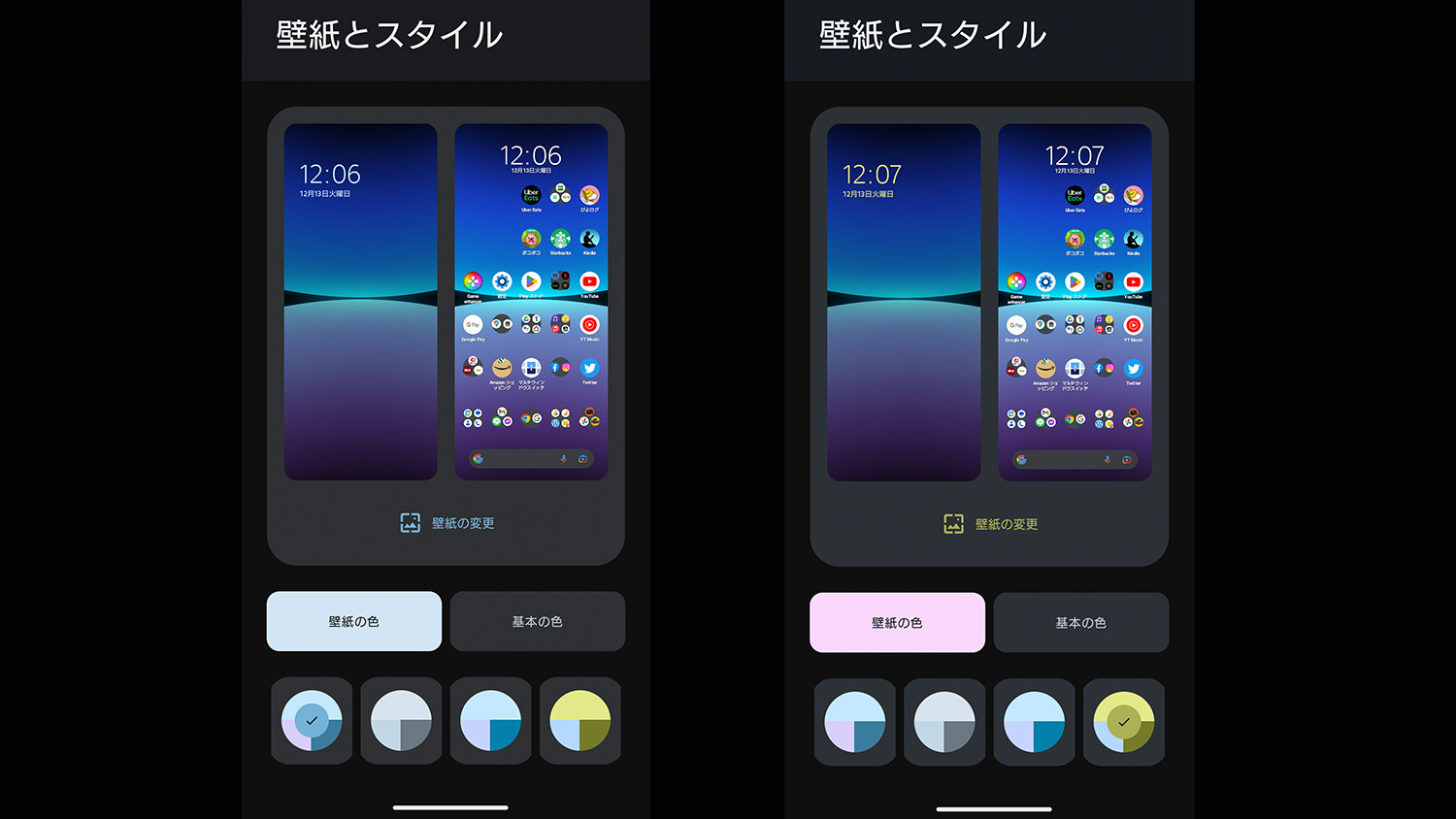 まず一つ目としてカラーテーマをカスタマイズすする際によりパーソナライズすることが可能に。ホーム画面の空いている部分を長押して壁紙とスタイルを押してテーマカラーを設定。