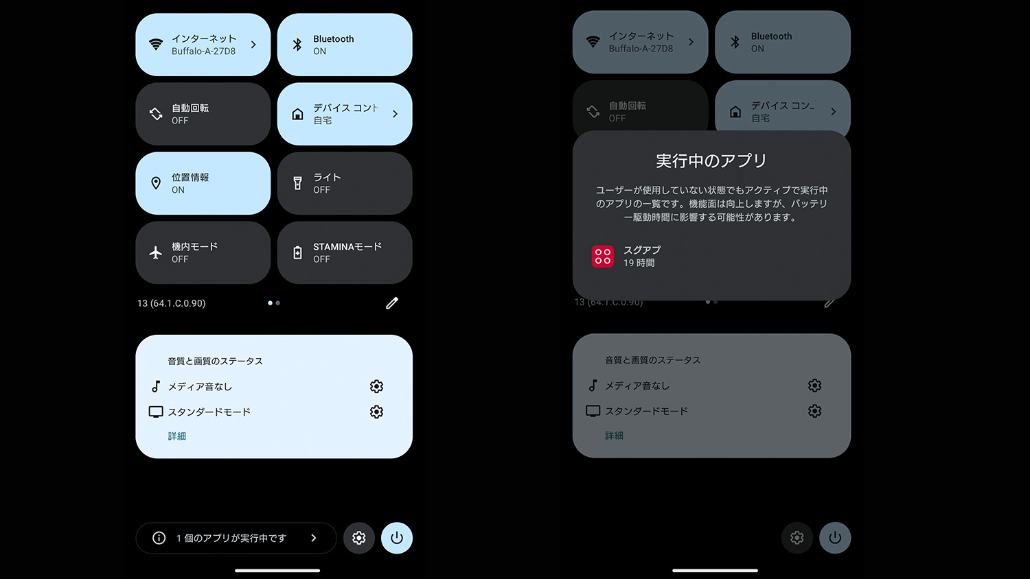 アプリが大量に動作していればRAMが逼迫され動作が不安定になることもあれば電池持ちにも影響を与える可能性があるので普段こまめに管理していない人はたまにクイックパネルから確認して上げるのがおすすめです。
