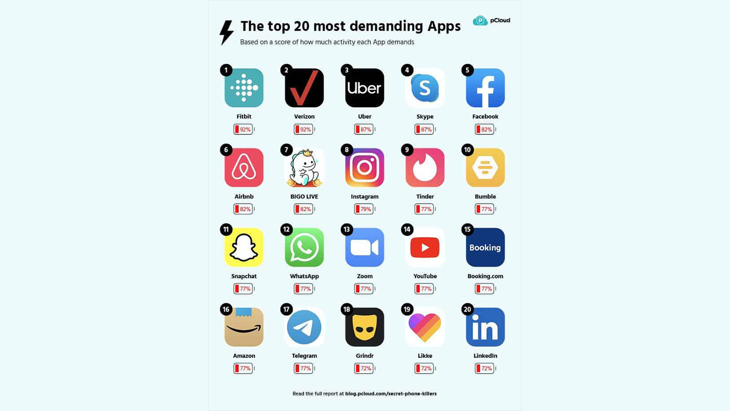 今回調査会社であるpCloudがスマートフォンのバッテリーに影響を与えるアプリトップ20を発表していることが判明したとしています。これらアプリはバグなどで消費電力が多いというわけではありません。