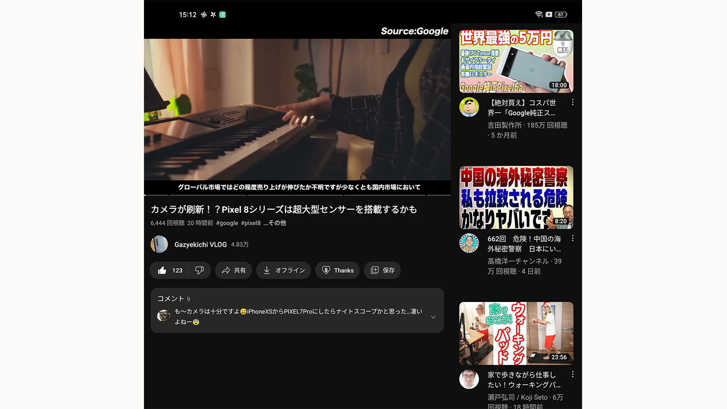 そしてYouTubeを全画面表示にした場合です。YouTubeやGoogle PhotoなどGoogle純正のアプリは全画面表示に切り替えなくてもある程度最適化されている印象です。