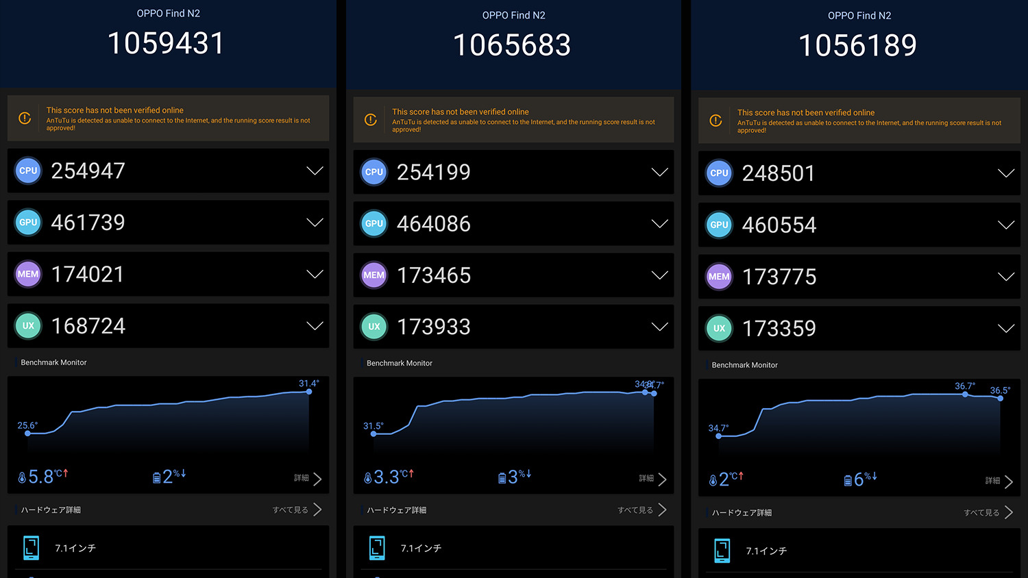 個人的には同じくSnapdragon 8+ Gen 1を搭載しているvivo X Fold+でも十分な性能なのでとりあえずベンチマークを3回連続でまわしてみました。