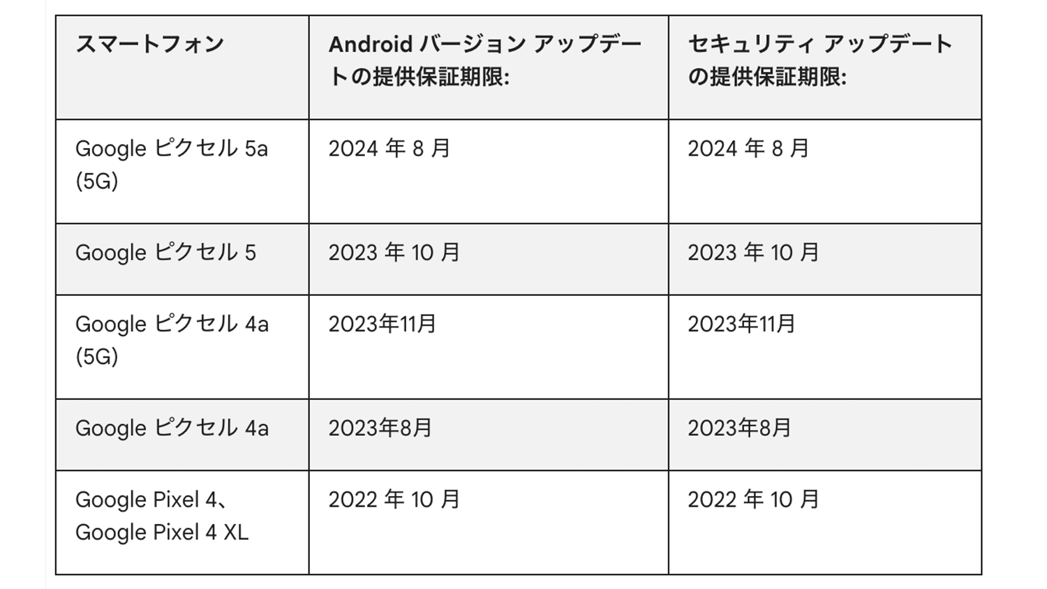 そして2023年においても残念なことにアップデートのサポートが終了する機種が存在しており予定通りであればPixel 4a/Pixel 4a 5G/Pixel 5の合計3機種。Pixel 4aに関しては8月まで終了。