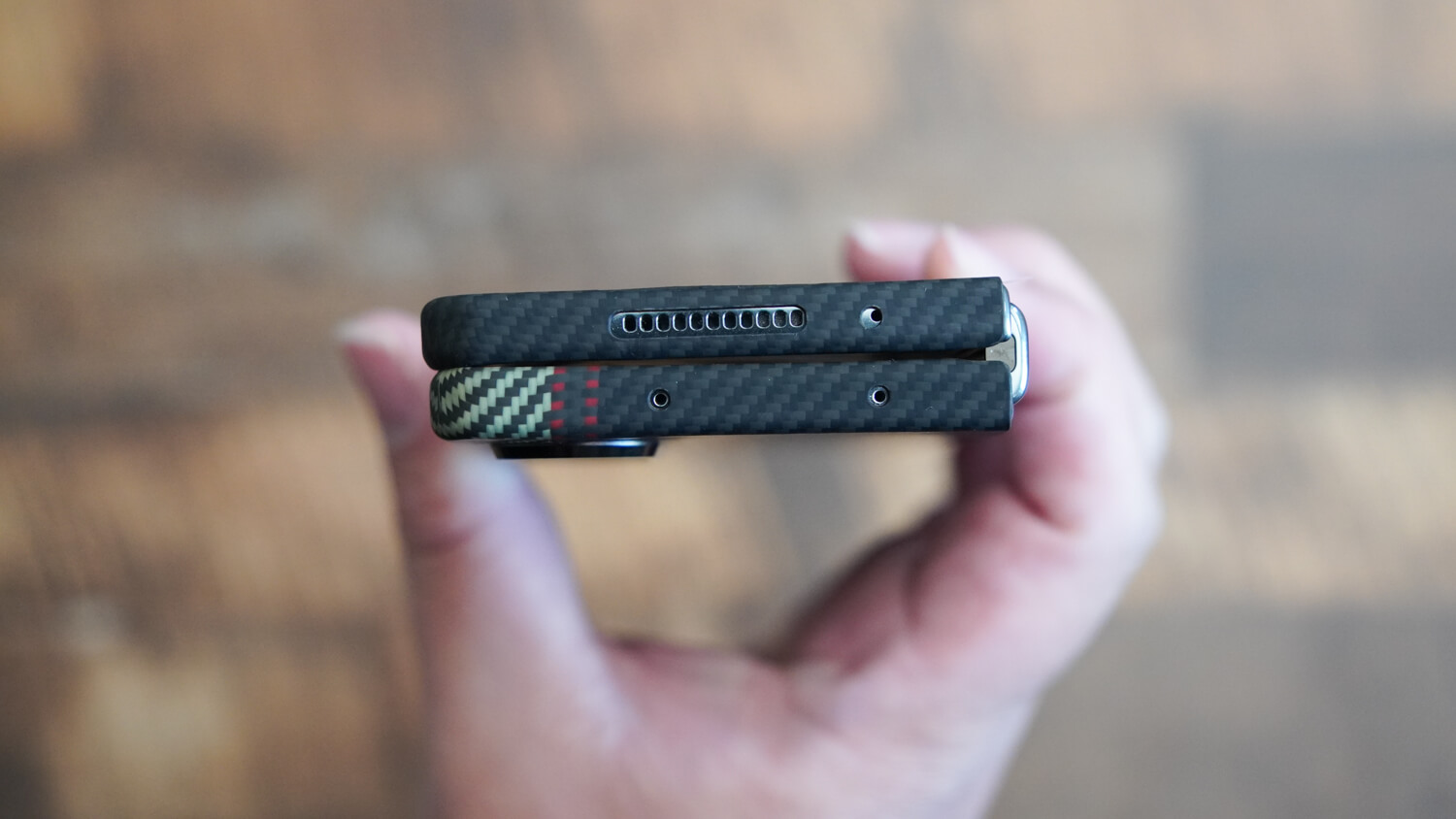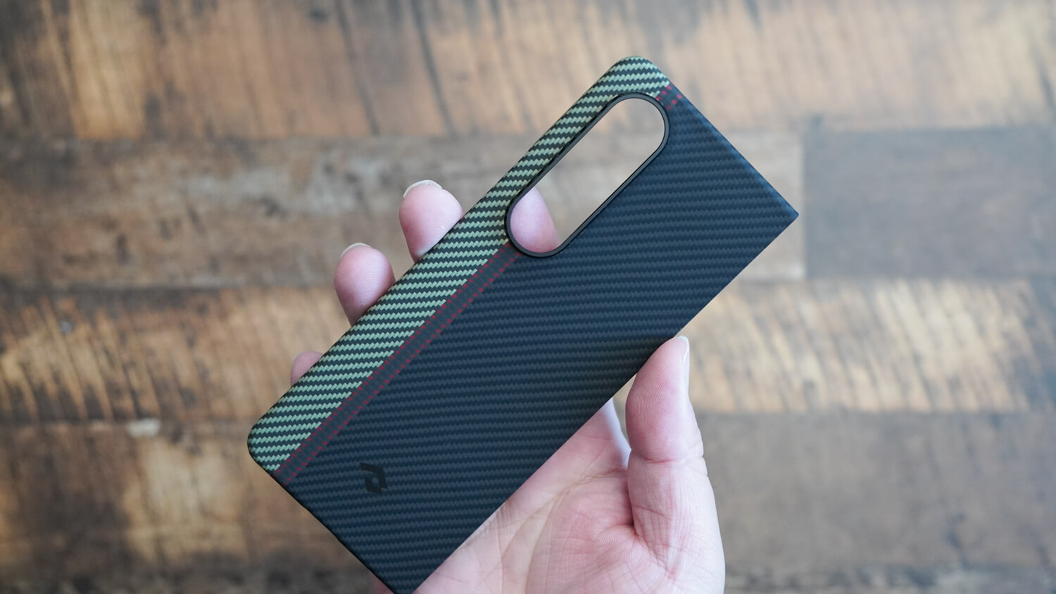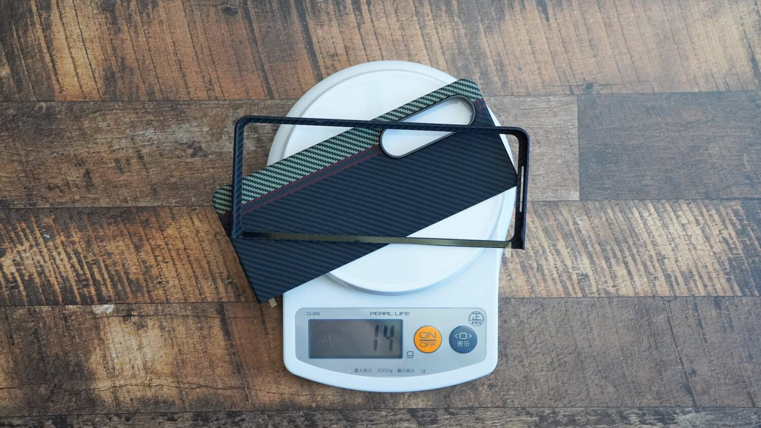 そして最後にバックパネル側です。アラミド繊維を使用しているためケース自体が軽い上に耐久性に優れていることが最大のポイント。一方で9999円と品質が高い分お値段が高いのもネックです。