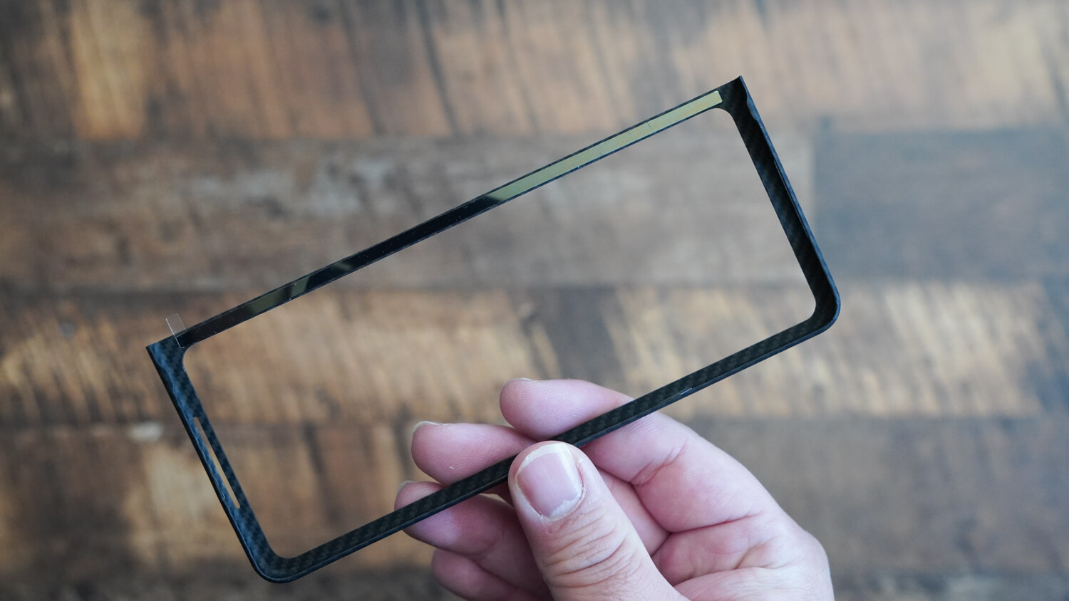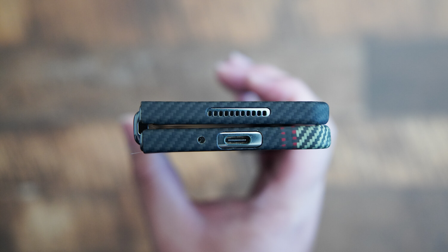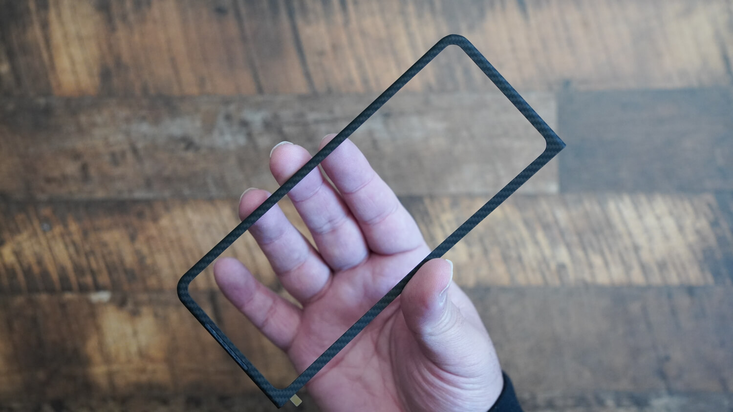 そして最後にバックパネル側です。アラミド繊維を使用しているためケース自体が軽い上に耐久性に優れていることが最大のポイント。一方で9999円と品質が高い分お値段が高いのもネックです。