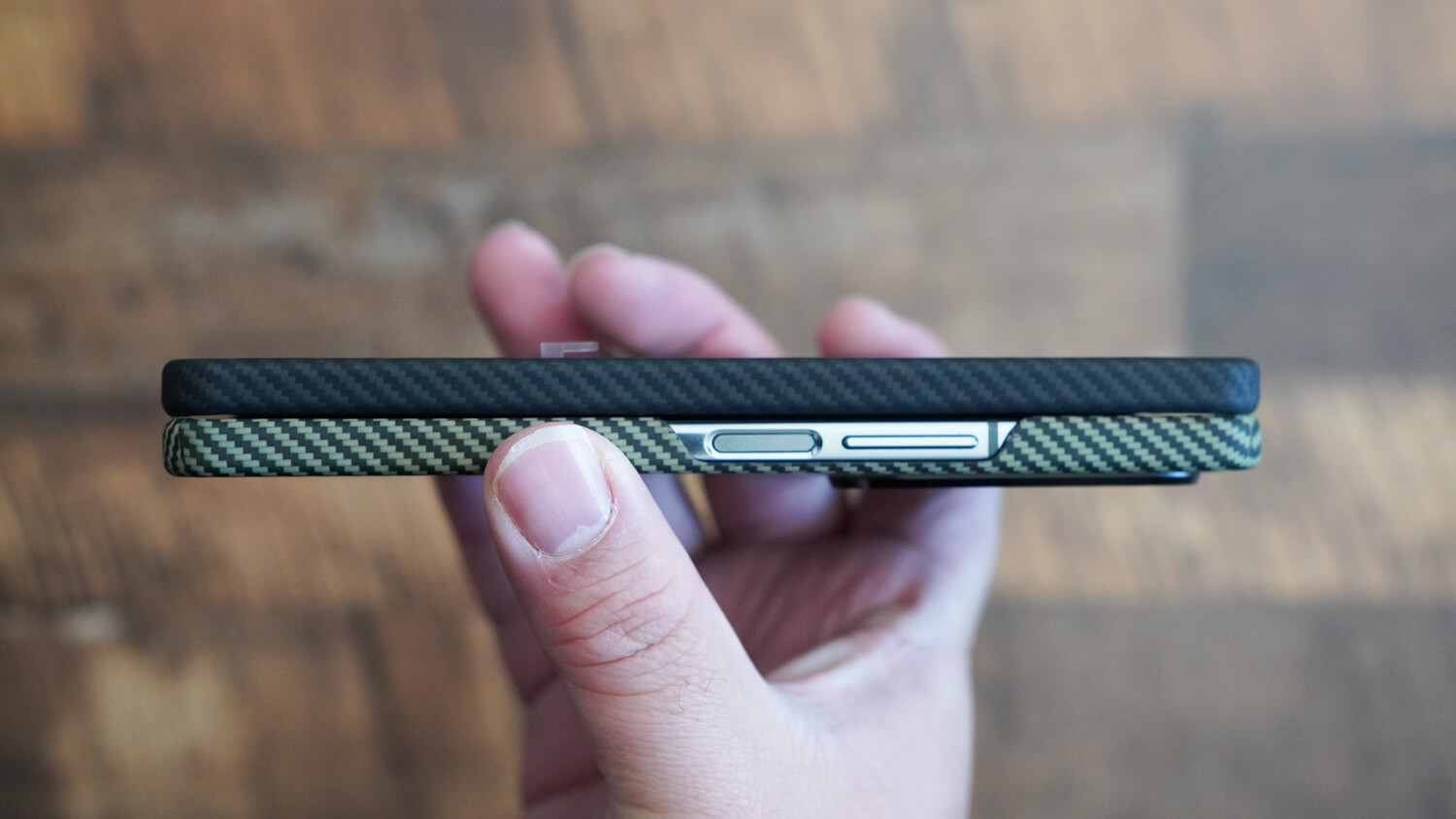 そして本体右側面です。物理ボタン部分がちょっと広めにひらいているためボタンを押す際に干渉しないのはありがたいところ。