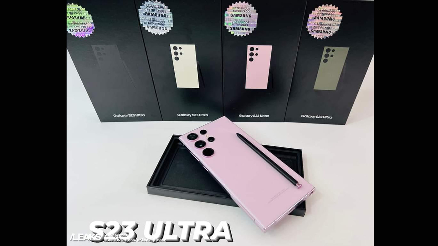 今回投稿されていた画像が上記の画像で事前情報通り4色展開。また現行モデルは機種名が大きく表示されている化粧箱でしたがGalaxy S23 Ultraに関しては本体のデザインも表示されているので地味に雰囲気が異なります。