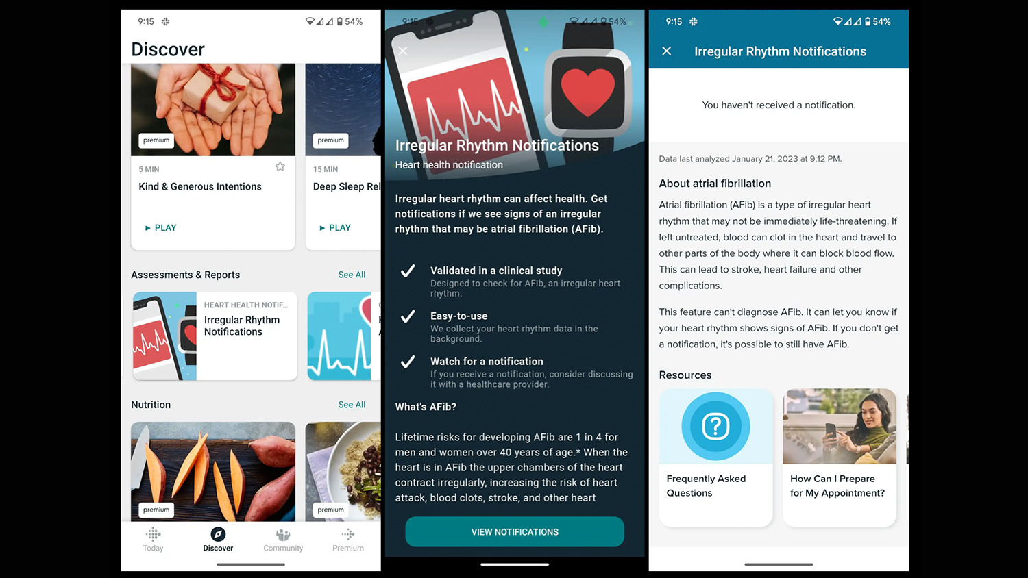 ただ一部ユーザーはFitbitアプリの発見タブに不規則なリズムの通知ページが表示されるとしており、通知を表示することが可能に加えて最後に分析されたのがいつなのか記録されているとしています。