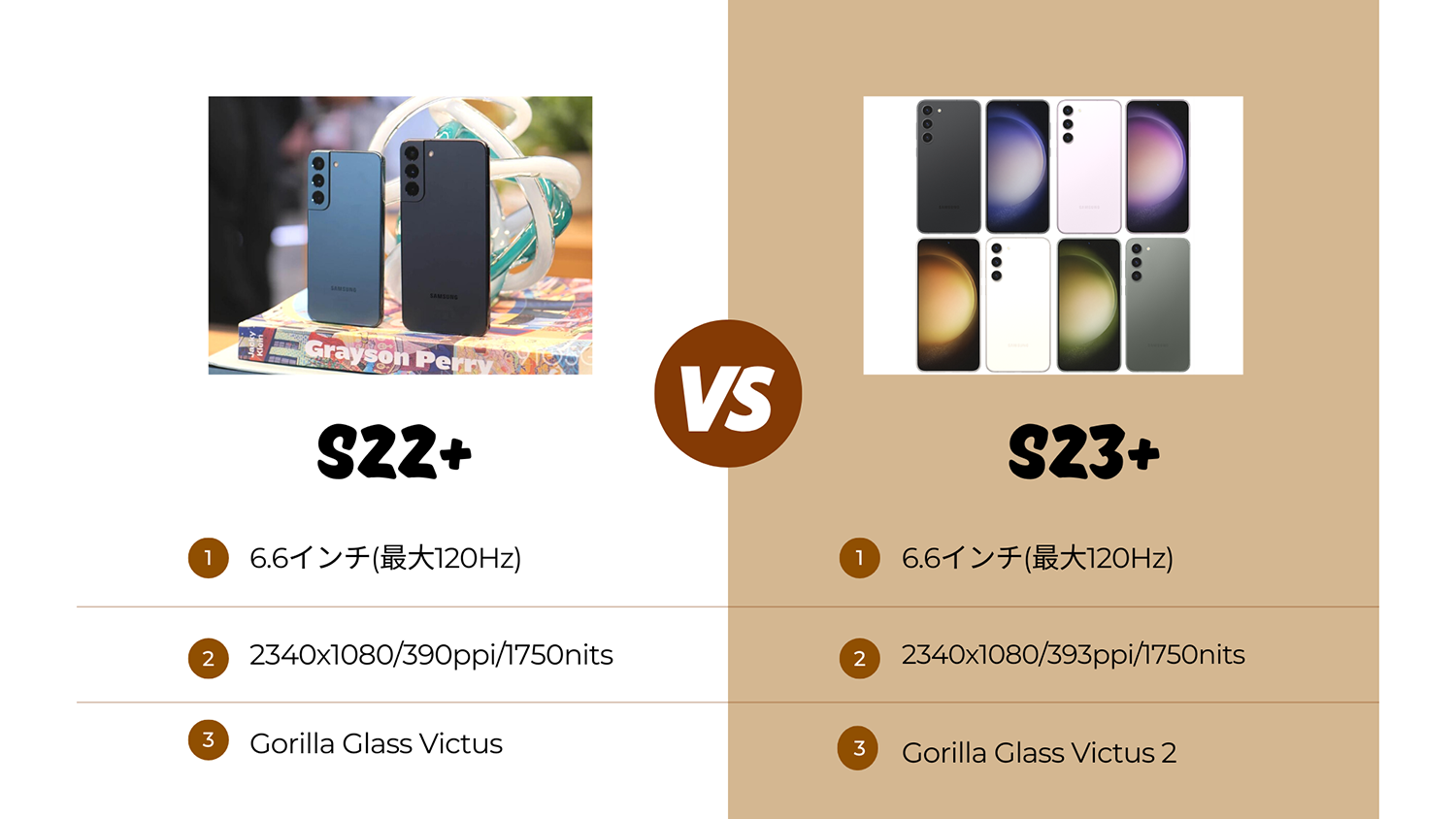 ディスプレイスペックに関してはほぼ一緒でGalaxy S23と同様ディスプレイの世代が刷新があるのか。またGorilla Glass Victus 2を採用することで本体の耐久性が改善している可能性があります。