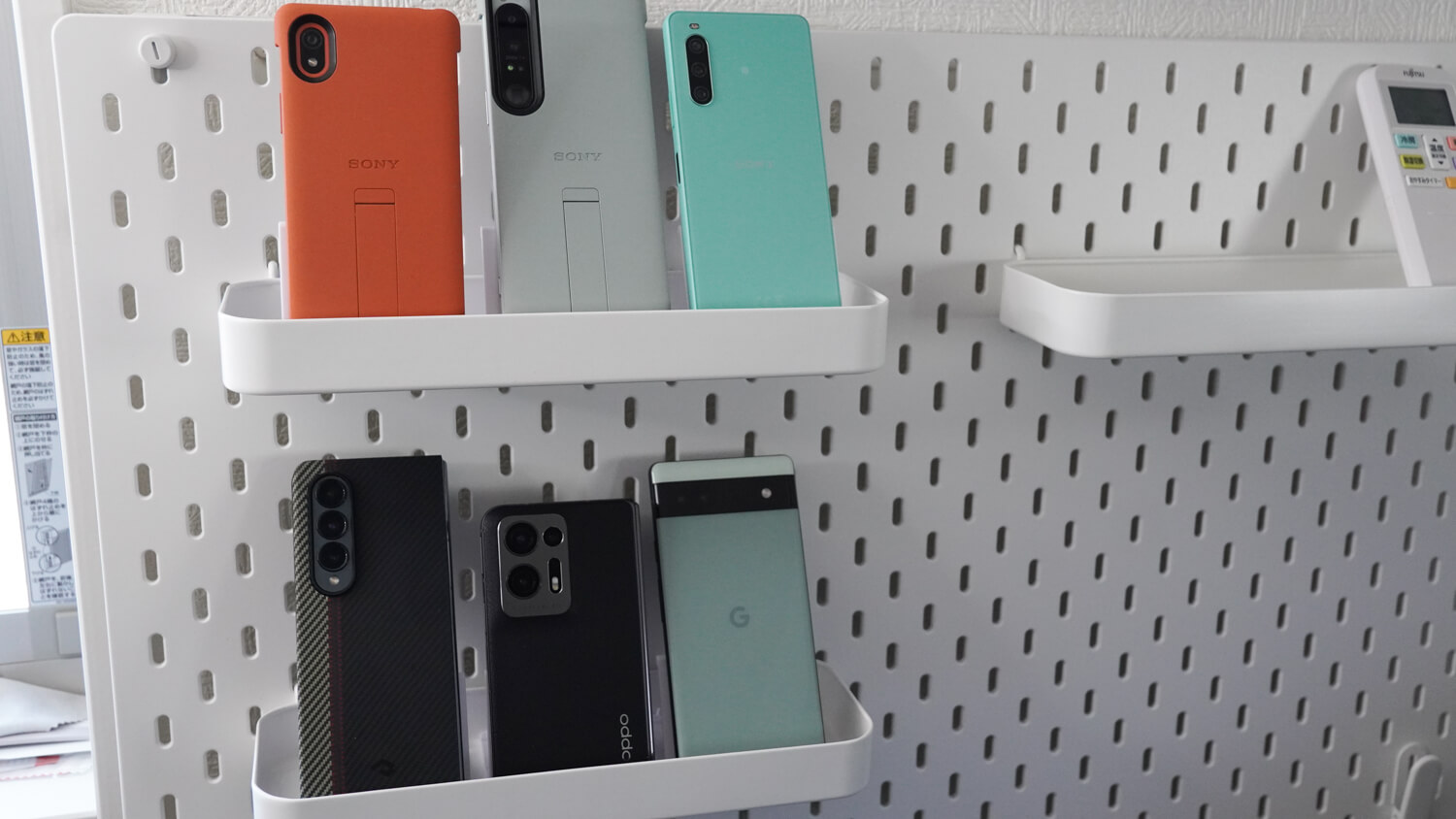 レビュー中の機種などは自宅の1階の作業スペースにおいてありそれ以外の機種は2階の仕事部屋の棚に機種によりますがケースをつけた状態で置いてある感じです。