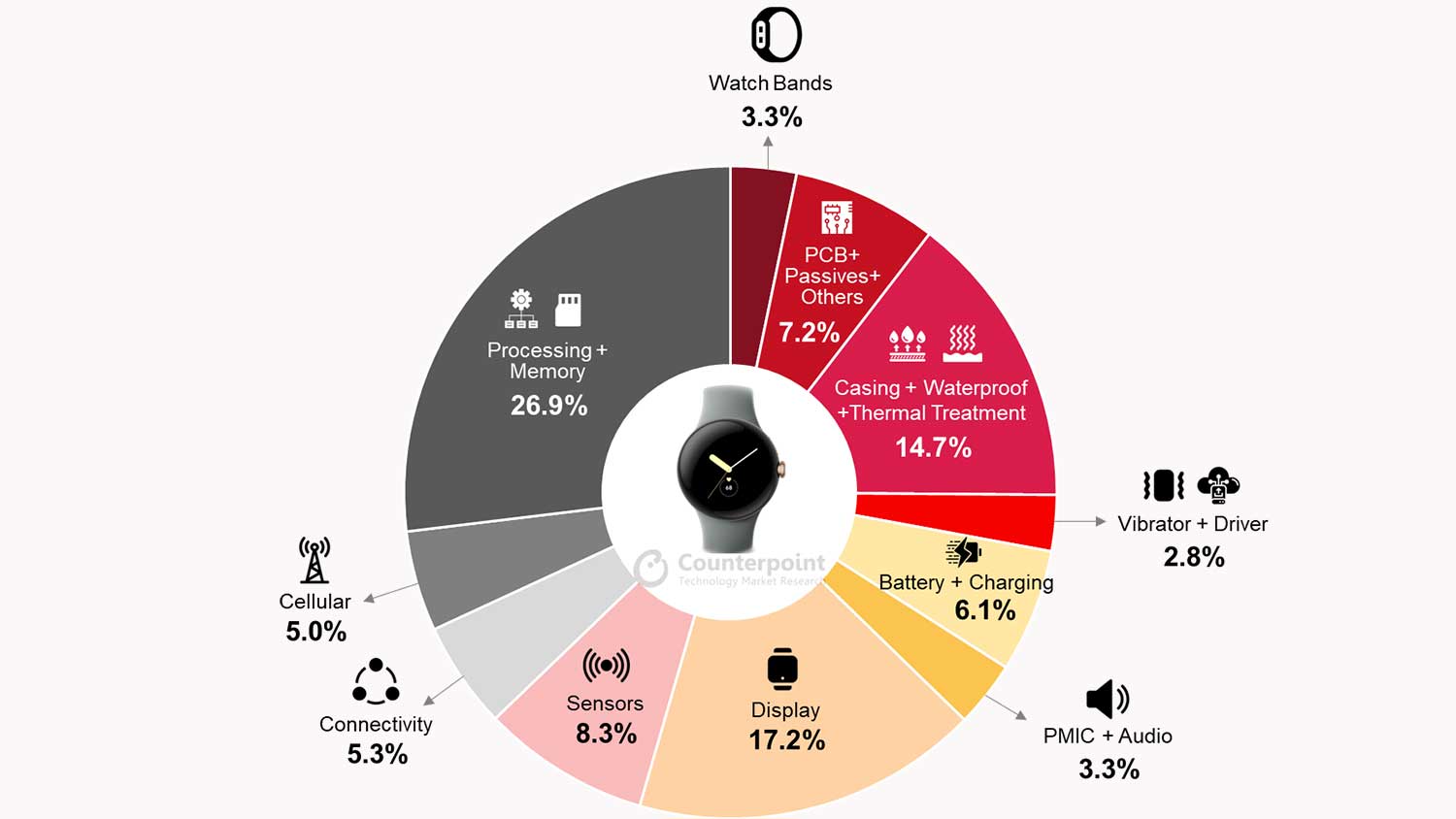 今回の情報によると市場調査会社であるCounterPoint ResearchがPixel Watchで採用されている部品コストを分析してセルラーモデルの場合$123のコストがかかっている可能性があると分析結果を公開しています。