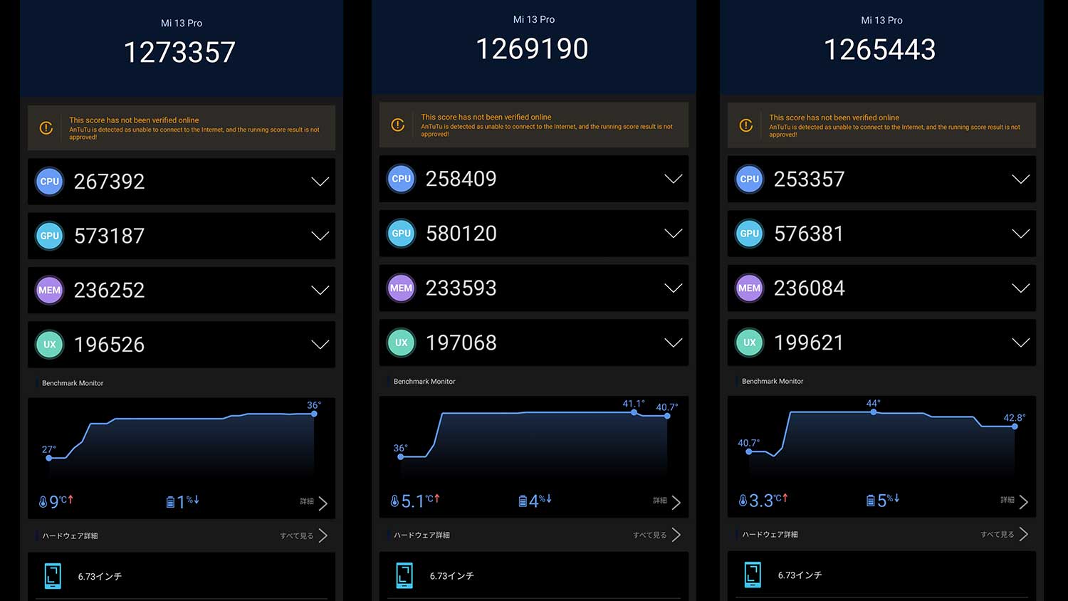 スコアで見ると126万点前後で十分でそれ以上に驚きなのがこのスコアをほぼ維持していること。一方で内部温度を確認すると回数を重ねるごとにじわじわ上がっていき最大で44度。