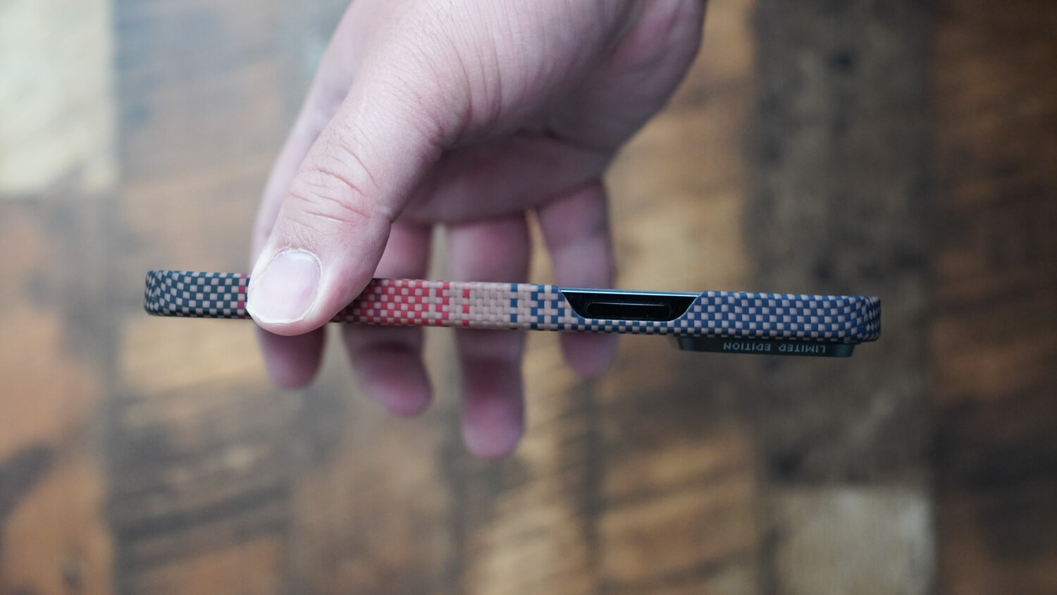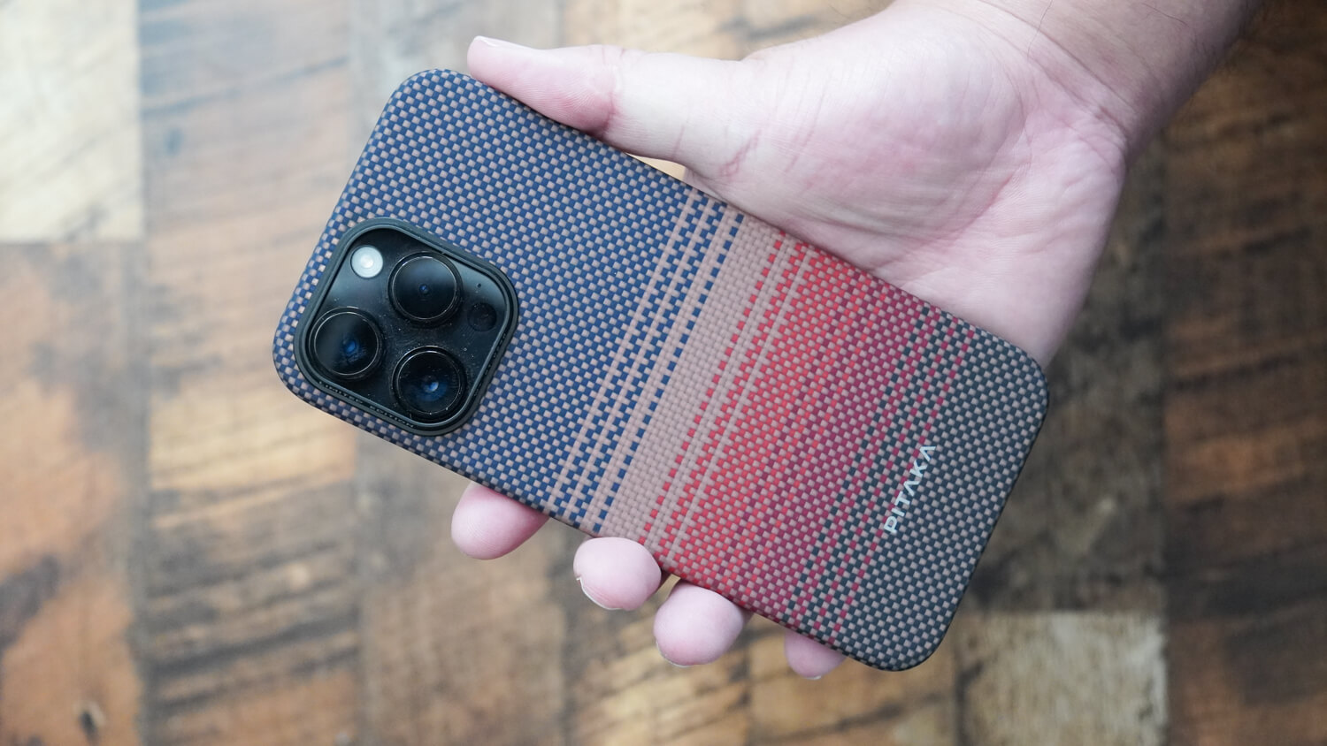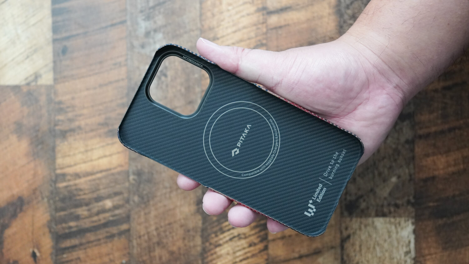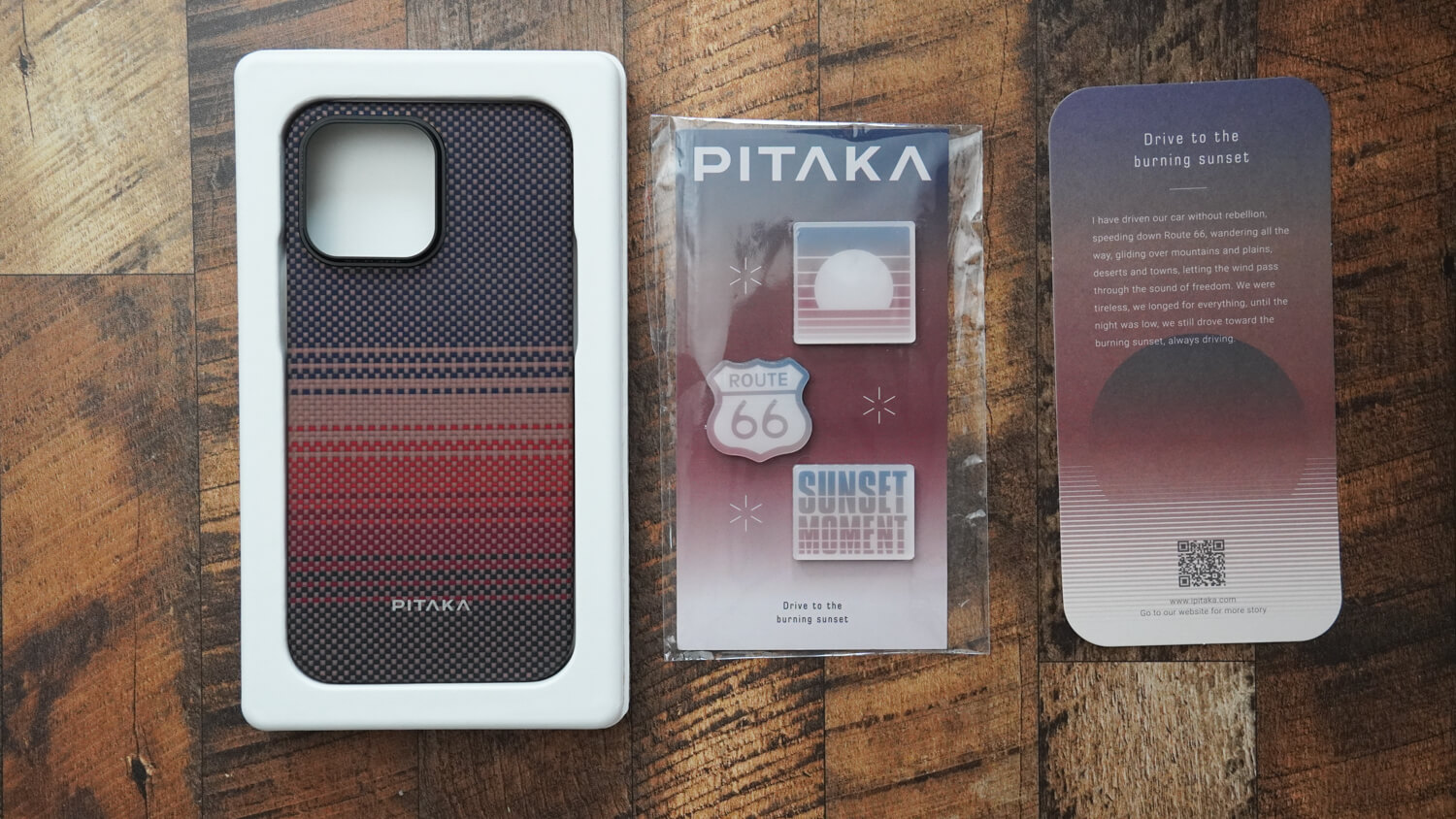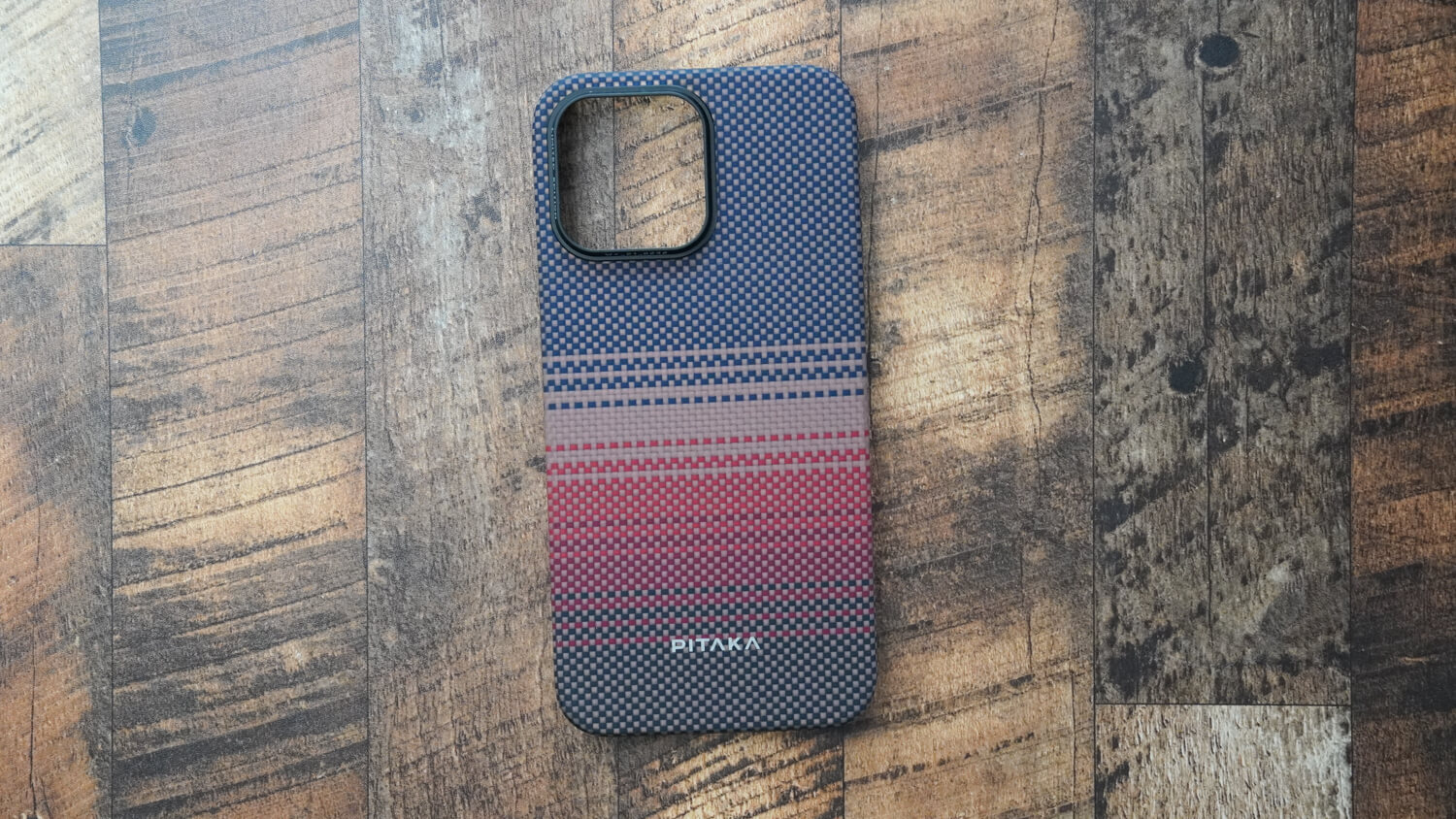ケース本体を確認していくとデザインが特徴的です。PITAKA独自のFusion Weavingにより立体的な浮き織りアラミドを実現し5色のアラミド繊維で日没の瞬間を表現しています。