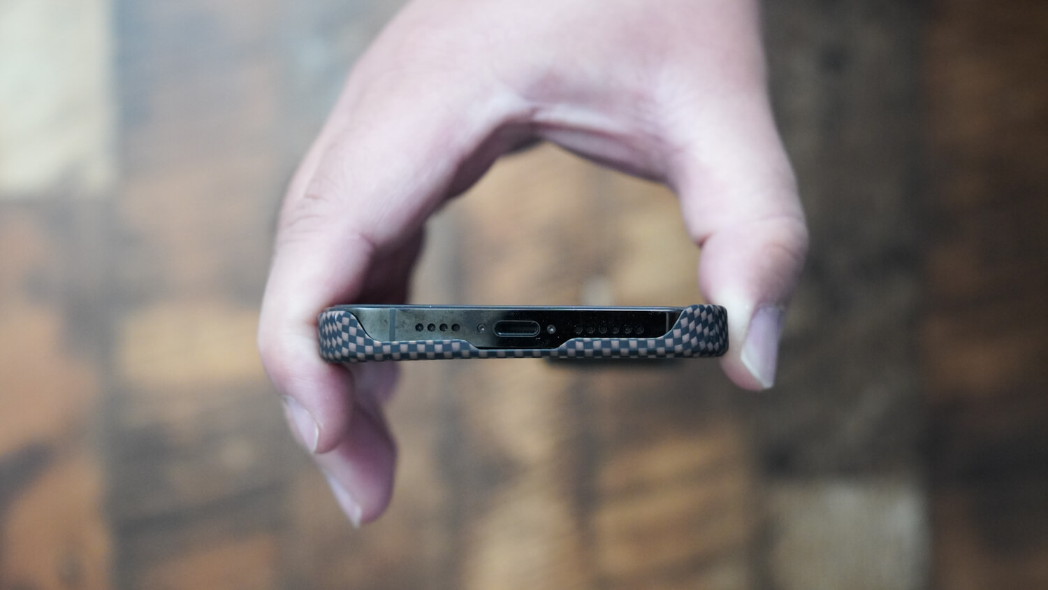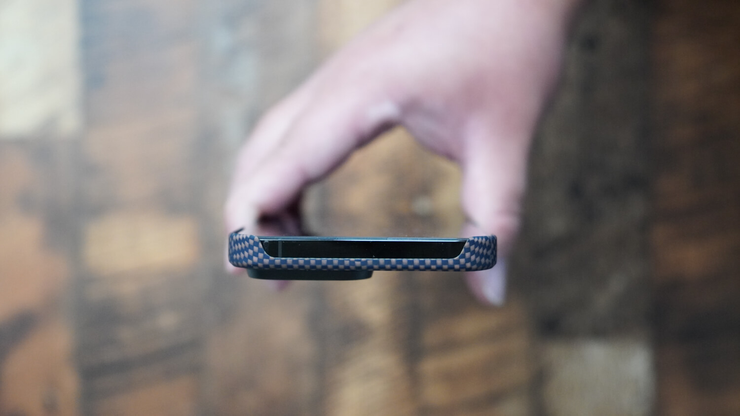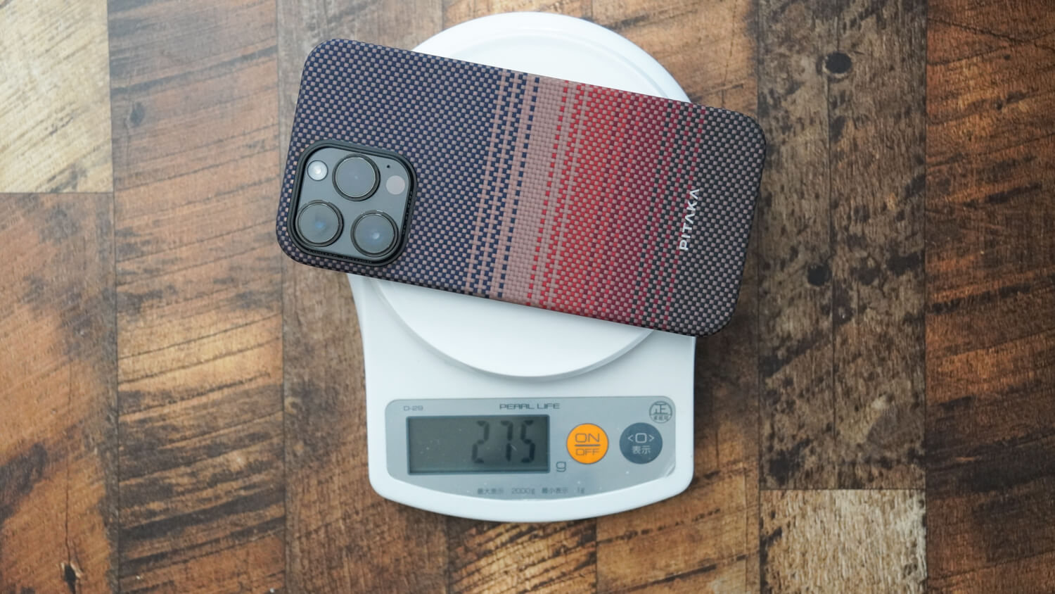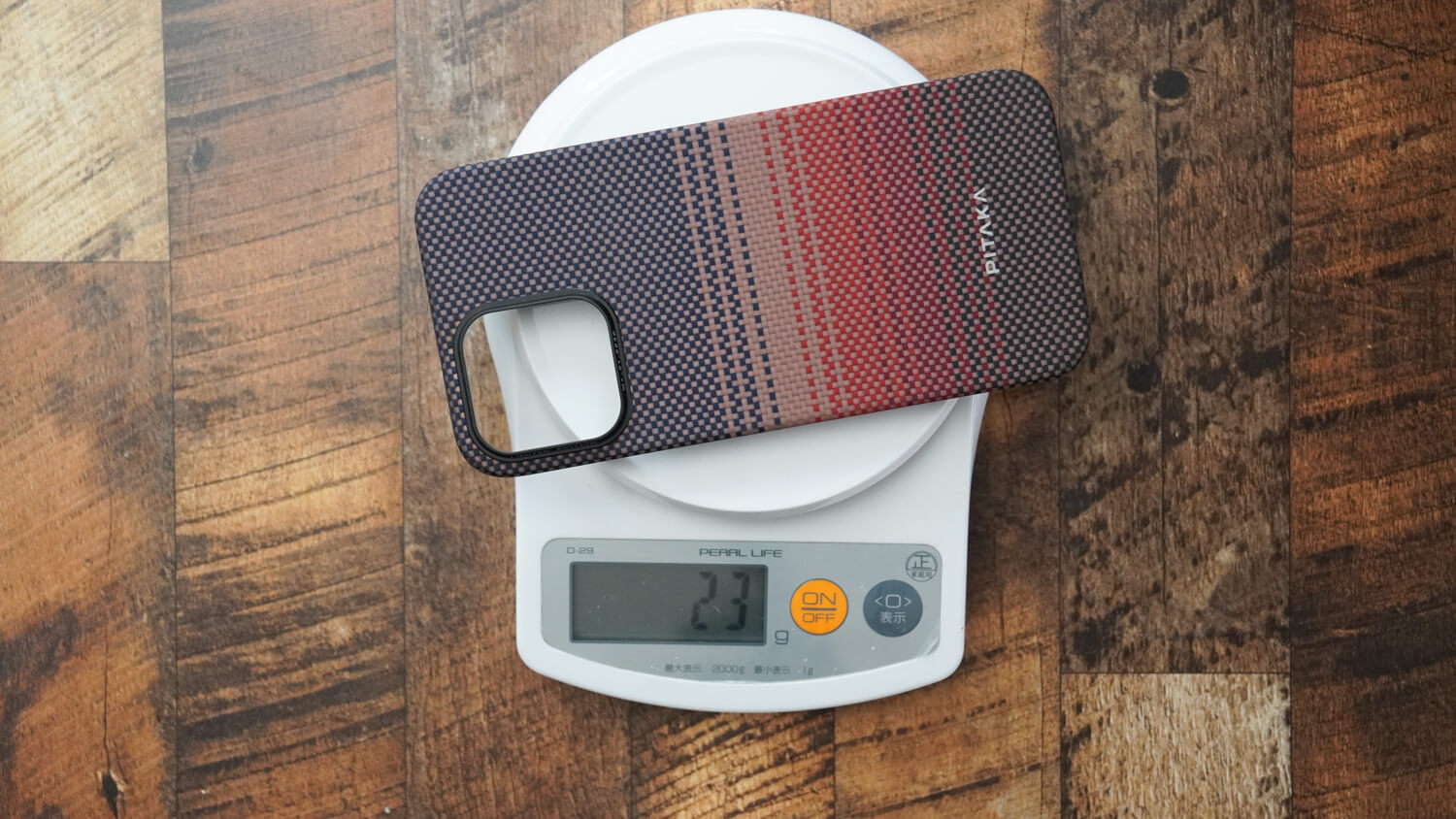 アラミド繊維をしたケースの特徴として軽さと堅牢性でぱっと見は重そうに見えましたが実際に測ってみると23gとiPhone 14 Pro Max用のケースであることを考えると軽めです。