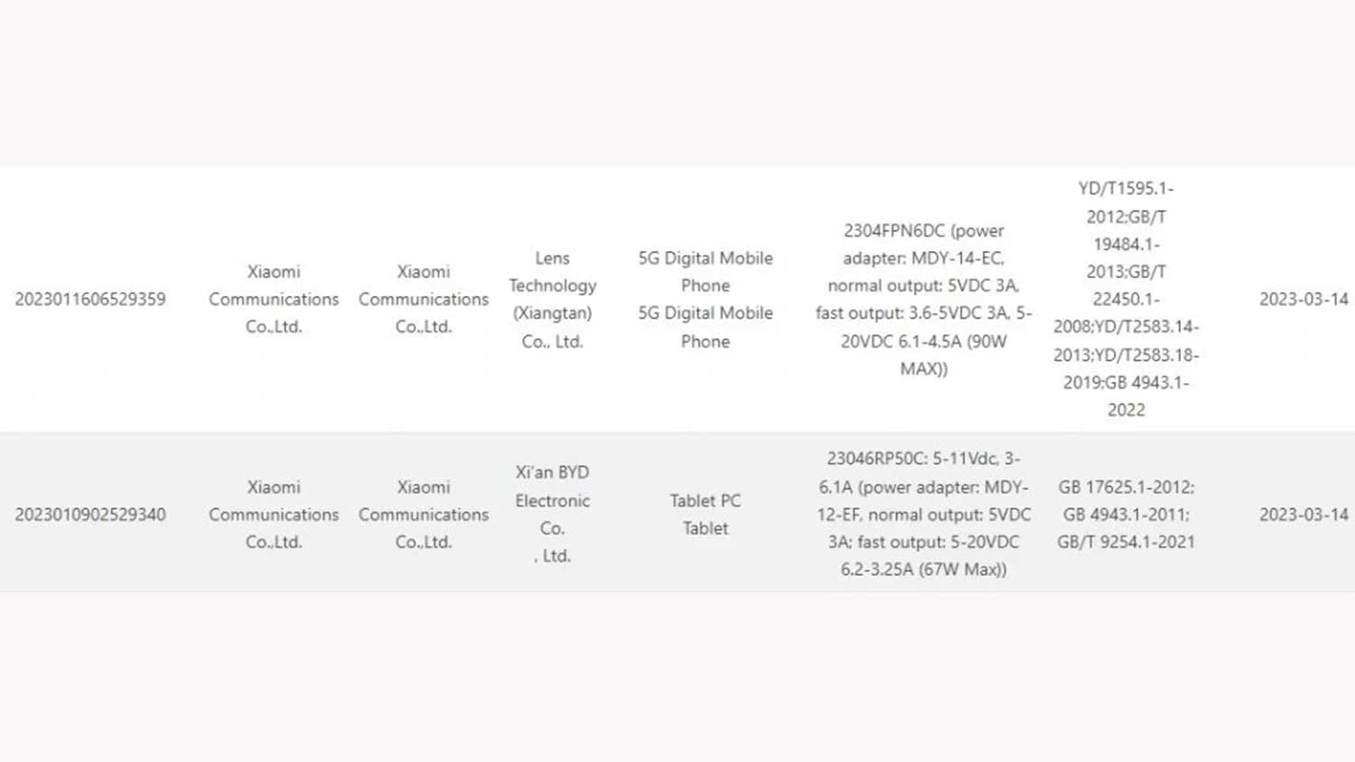上記の画像からもXiaomi 13 Ultraのモデル番号とされている2304FPN6DCは90Wの急速充電に対応していることを確認することができます。合わせてXiaomi Pad 6は67Wの充電に対応している可能性があることを確認できます。