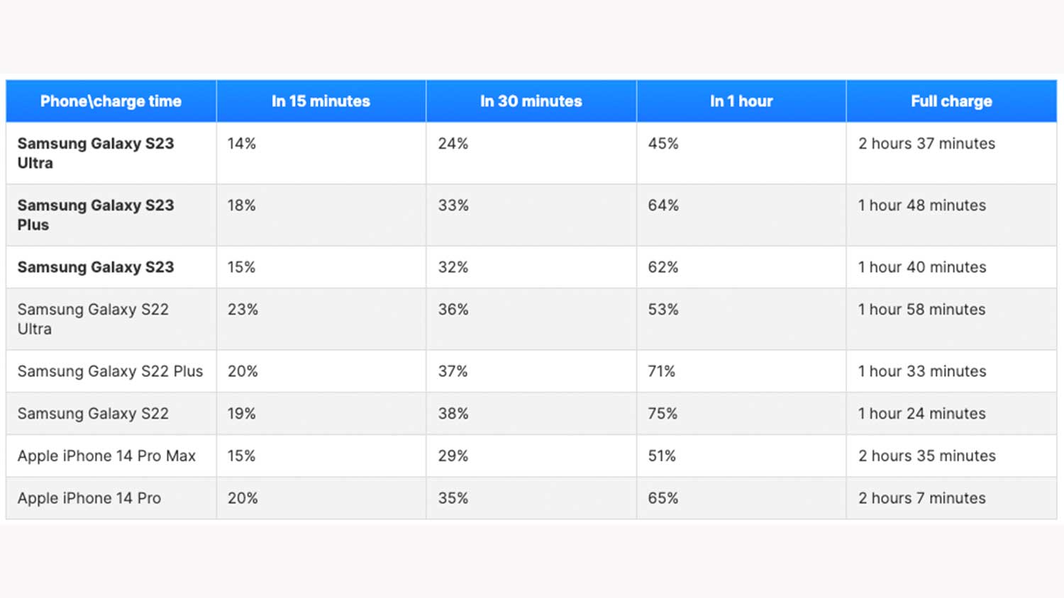 一方で今回同サイトが指摘しているのがワイヤレス充電でGalaxy S23シリーズは充電速度がより制限されています。上記の画像は純正のワイヤレス充電器での充電速度テストの結果です。