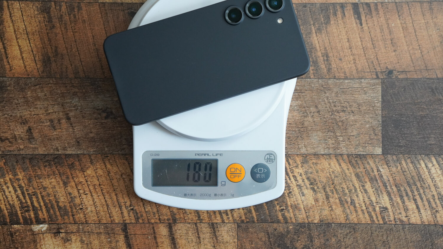 そしてケースをつけた状態での重さを確認するとGalaxy S23は先ほど紹介したガラスフィルムをつけた状態で180gとかなり軽い。