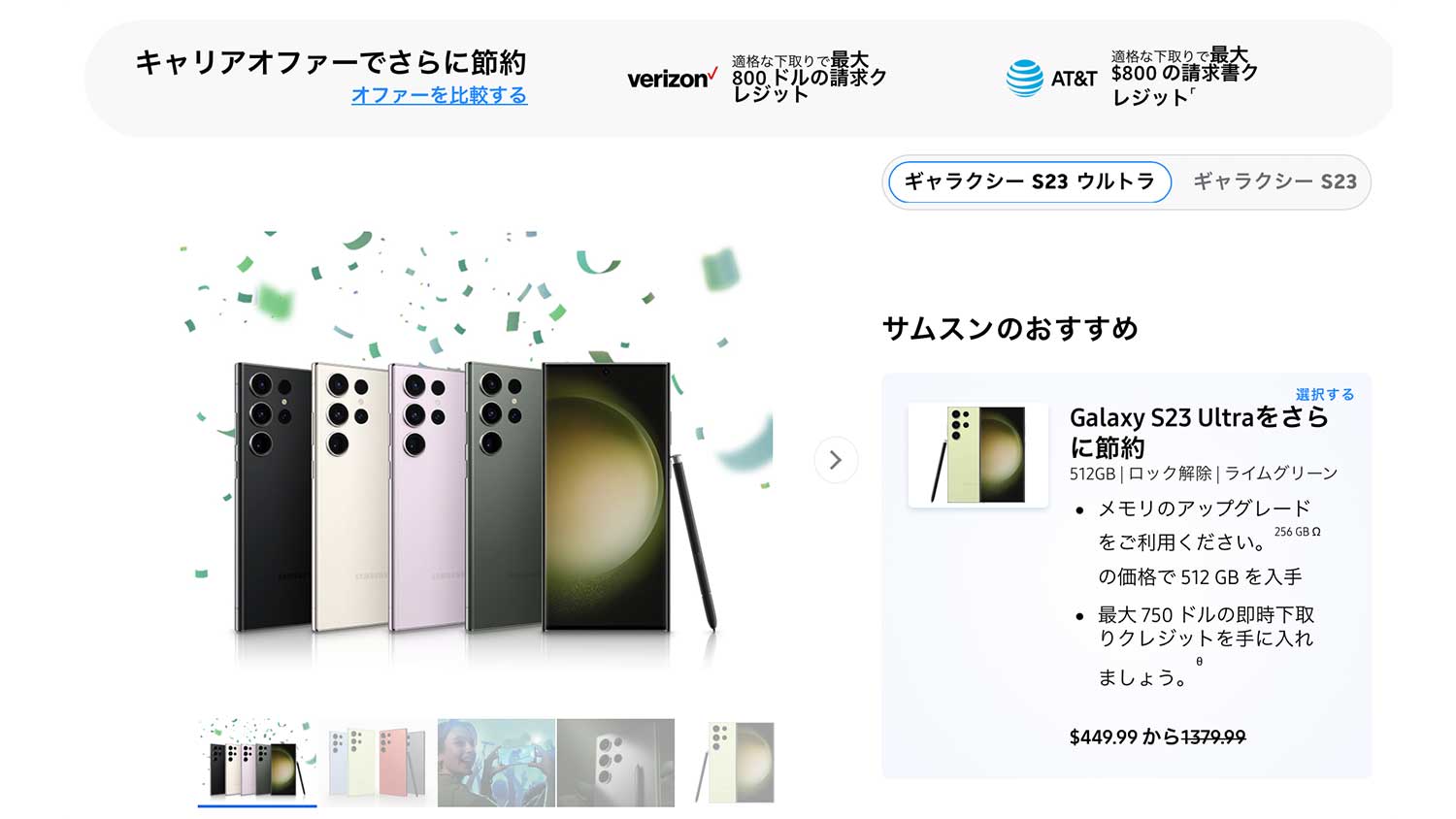 今回の情報によると米Samsungが母の日セールとしてGalaxy S23 Ultraを大幅値引きで販売していることが判明したとしています。まずストレージ無料アップグレードとなっており512GBモデルが256GBの価格で購入することが可能。