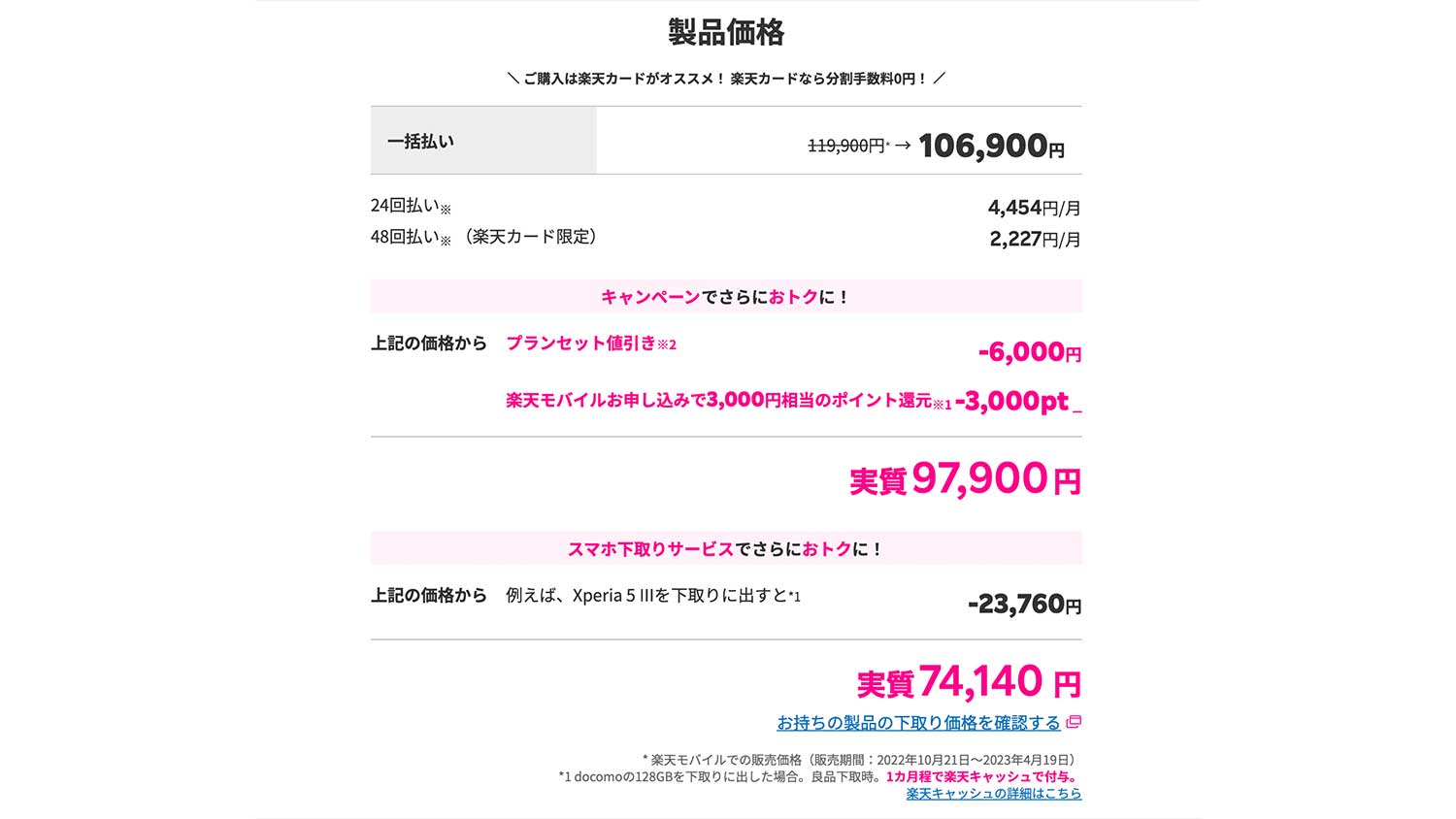 また条件を満たすことで9000円分のポイント還元を受けることができるので実質9万7900円で購入できると一括価格の安さが何よりの魅力だと思います。楽天版はdocomoなどと比較するとカラバリが乏しくブラック/ホワイトの2色展開であるところがデメリット。