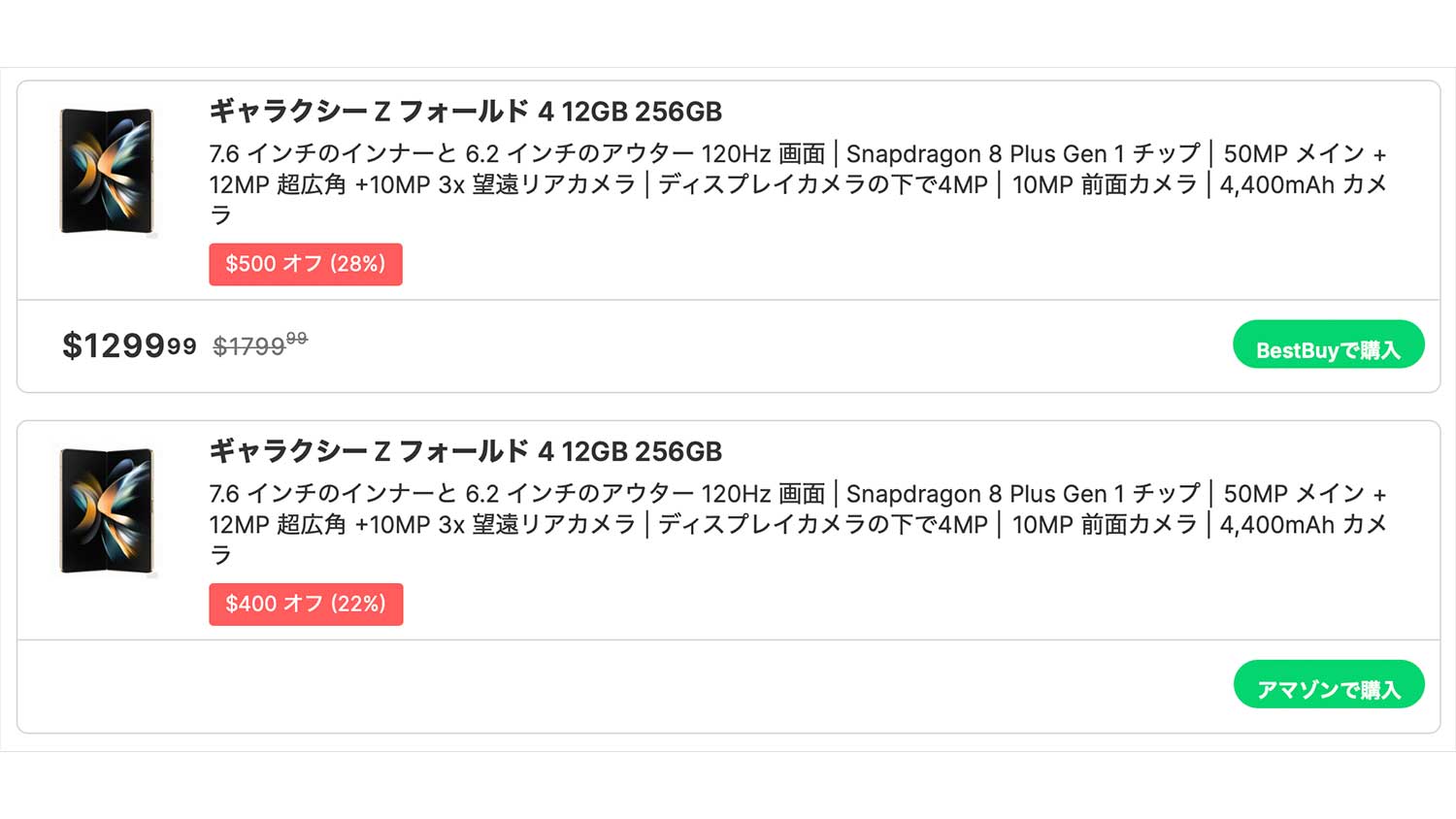 今回米Amazonと米Best BuyにおいてGalaxy Z Fold 4が大幅値引きで販売されていることが判明したとしています。上記の画像からも米Best Buyでは$500の値引きで$1299で購入することが可能です。