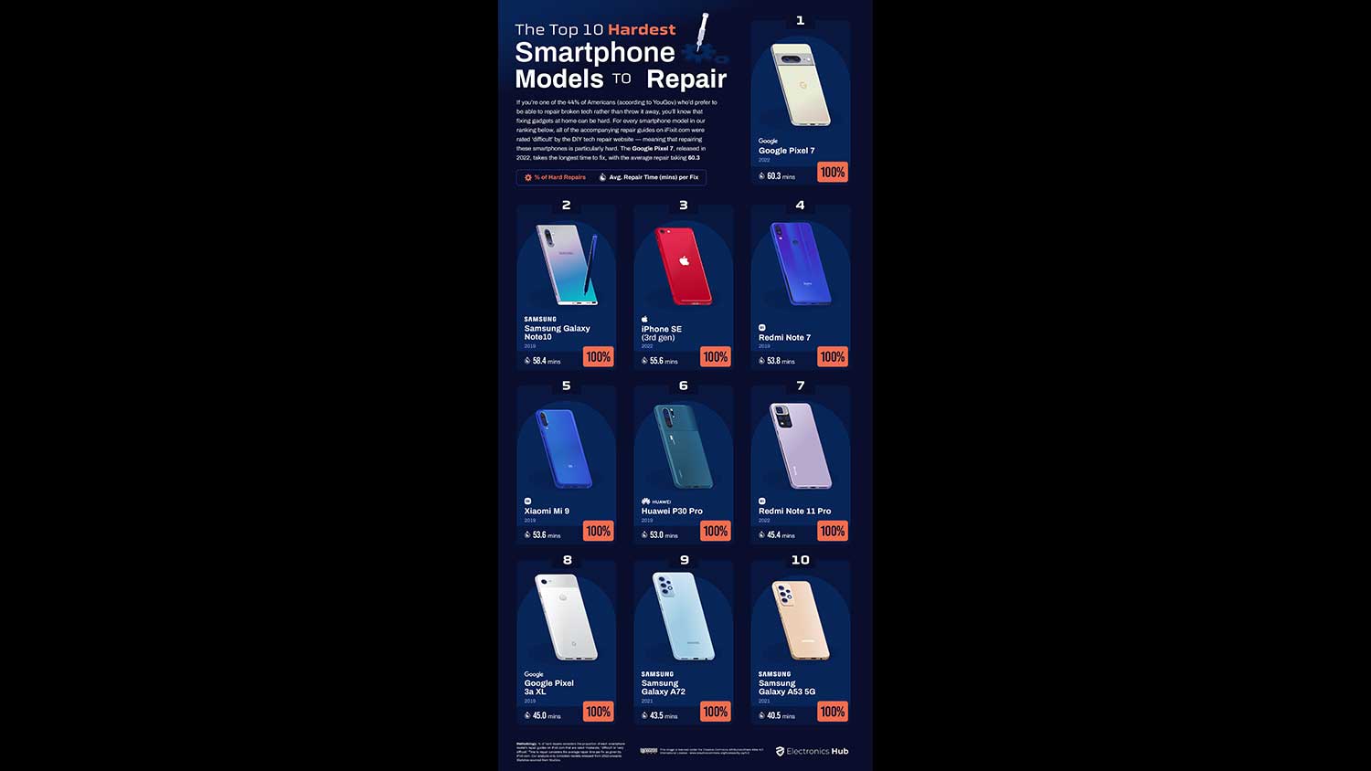 技術情報 Web サイトであるElectronics HubがiFixitに平均修理時間や修理ガイドの難易度から情報を集計して自分で最も修理が簡単な機種や逆に難しい機種などのレポート結果を公開。