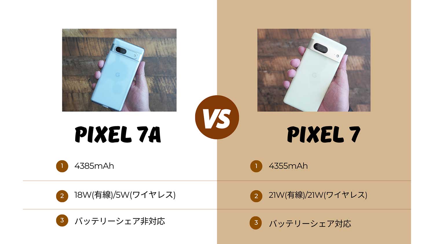 また先日の記事で間違ってお伝えしてしまったのがバッテリーシェアでPixel 7aは非対応。なのでワイヤレス充電が5Wと遅いのか不明です。バッテリー容量がほとんど一緒のため充電時間は単純にPixel 7の方が速いです。