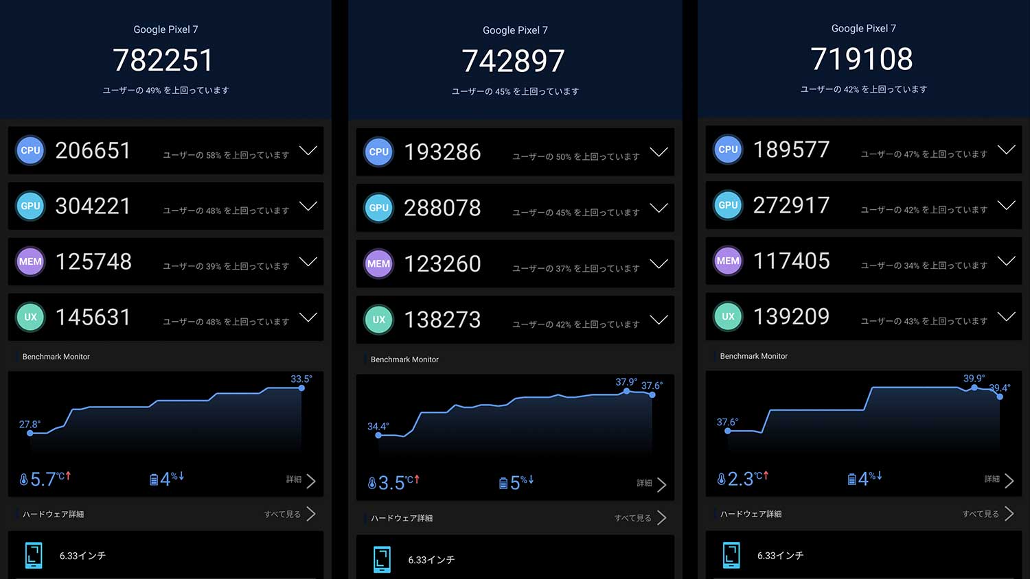 あくまでも今回のベンチマークの結果から判断すると内部温度が同程度まで上昇した時にPixel 7はパフォーマンスを維持しているためスコアにそこまでの変動がない感じ。