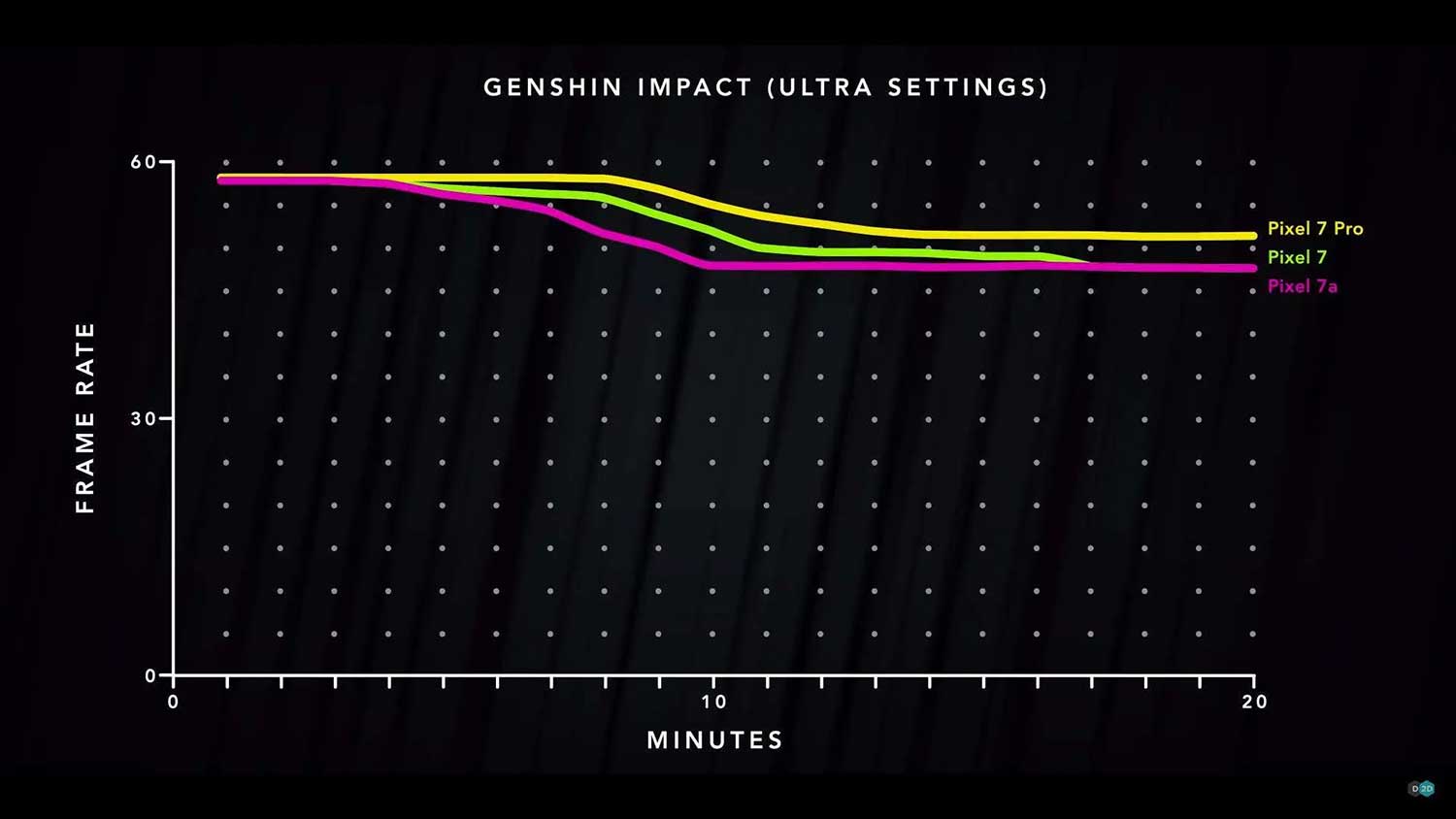 原神でベンチマークを計測したみたいですが、Pixel 7aは最初こそ優秀なものの60fpsを下回るのがPixel 7シリーズと比較して早い。単純の見ればPixel 7シリーズより早くスロットルダウンということになります。