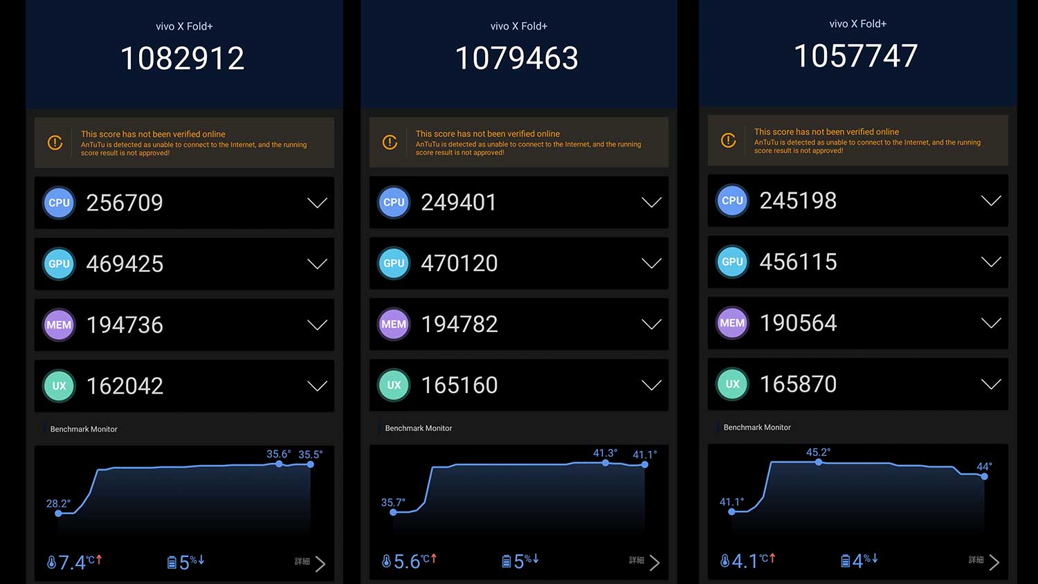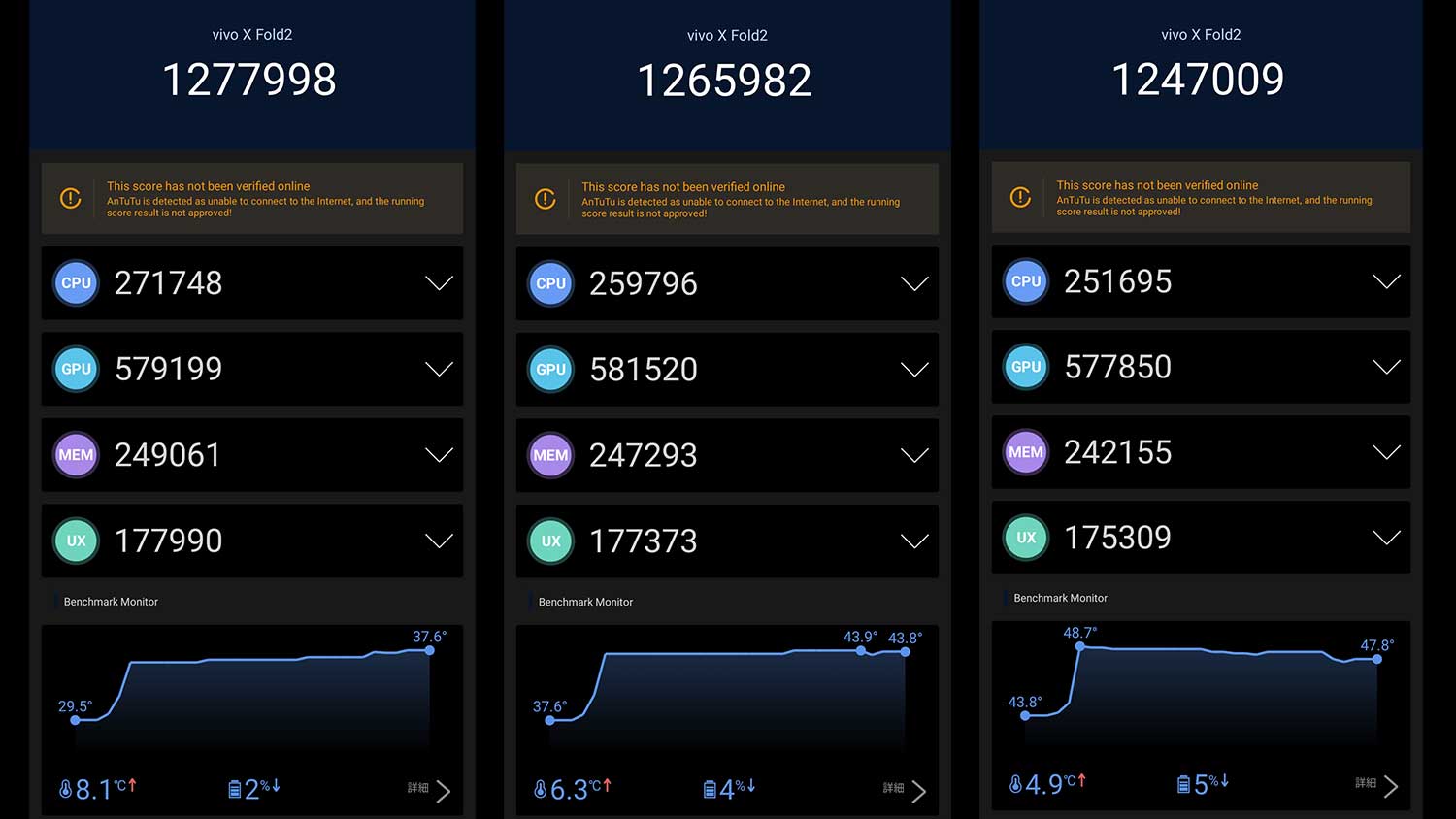 また計測終了のタイミングで外部温度も計測してみましたがvivo X Fold+は32.7/37.7/39.0度に対してvivo X Fold 2は37.1/40.7/46.1度とかなり熱いです。Vivo X Fold+は少し暖かい程度ですがvivo X Fold 2は明らかに熱いという感じ。
