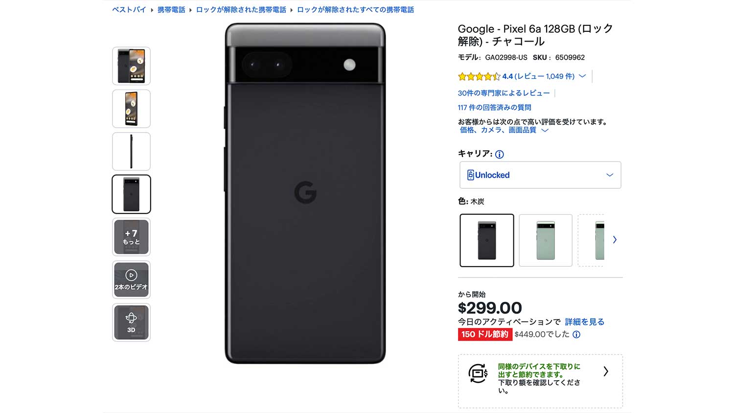 今回の情報によると米Best BuyにおいてGoogle Pixel 6aが史上最低価格で販売されていることが判明したとしています。上記の画像からも購入時にアクティベーションが必要とはいえ僅か$299で購入可能とめちゃくちゃ安いです。