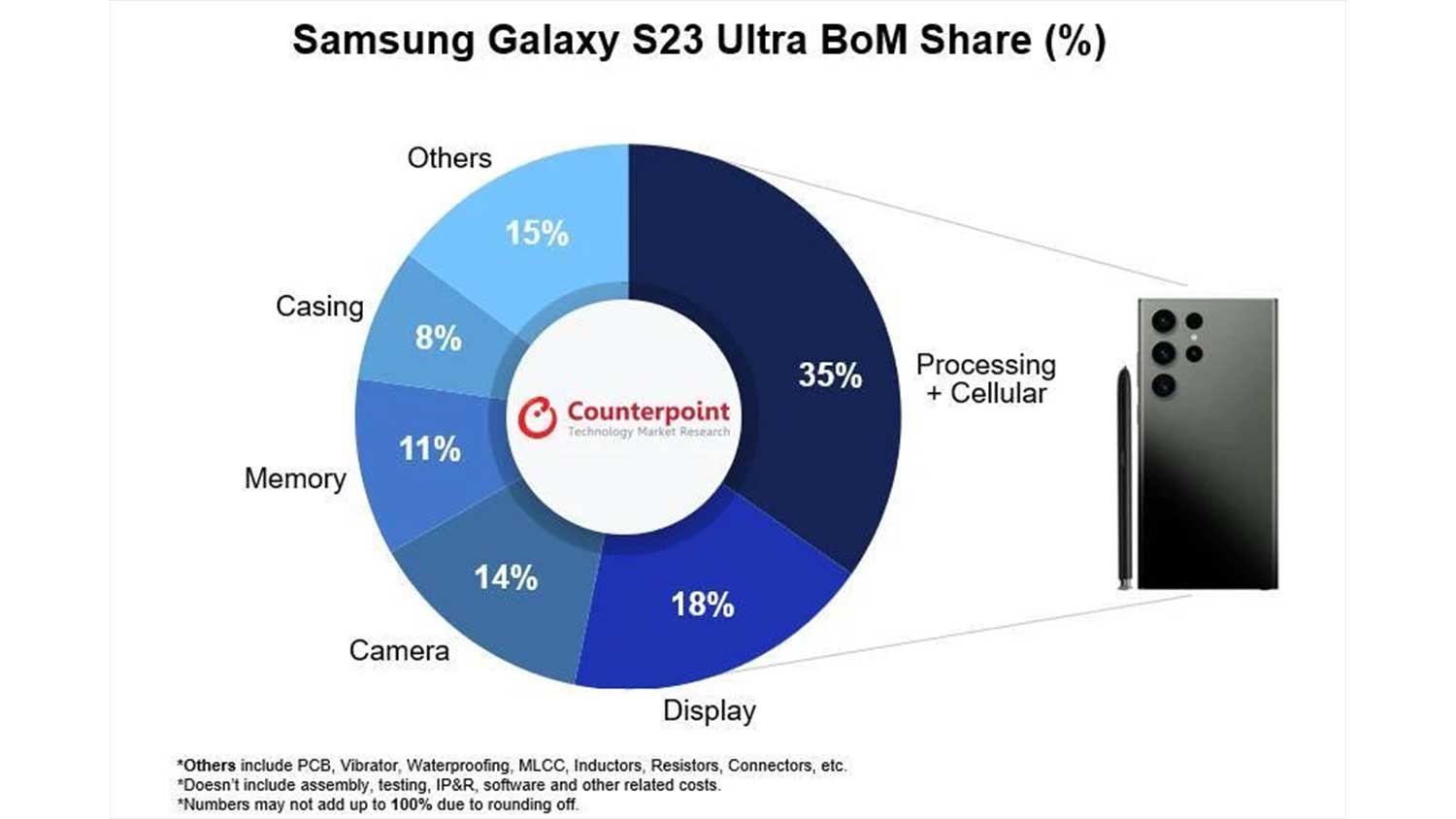 今回の情報によると市場調査会社であるCounterpointがGalaxy S23 Ultraの部品分析結果を公開していることが判明したとしています。上記の画像からも通信関連の部品とSoCで全体の35%の構成を占めていることを確認することができます。