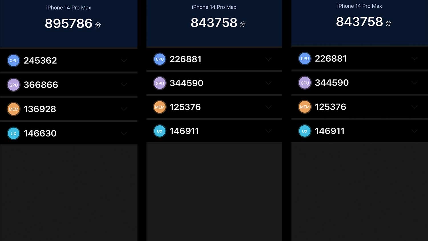 またベンチマークスコアを見ても負荷をかけた際のパフォーマンスの持続性はiPhone 14 Pro Maxの方が優秀に感じます。ちなみにカメラ撮影持続テストを