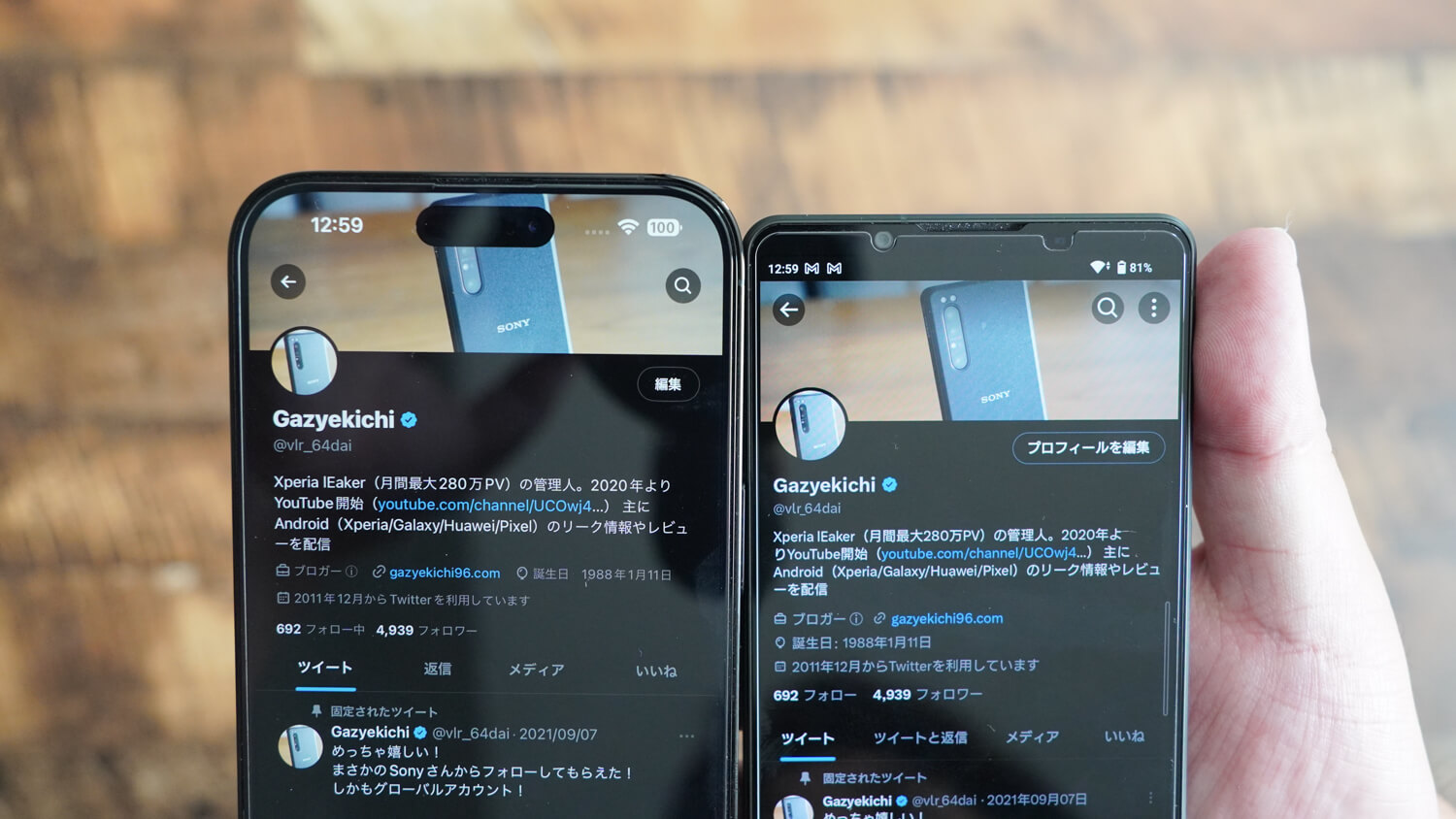 次にディスプレイですがアスペクト比の違いからもiPhone 14 Pro Maxの方が横幅ある分コンテンツが大きく表示され見やすいです。ディスプレイサイズの違いももちろんありますがXperia 1Ⅴはアスペクト比21:9に加え横幅も6mm程度短いことからコンテンツは小さめに表示。