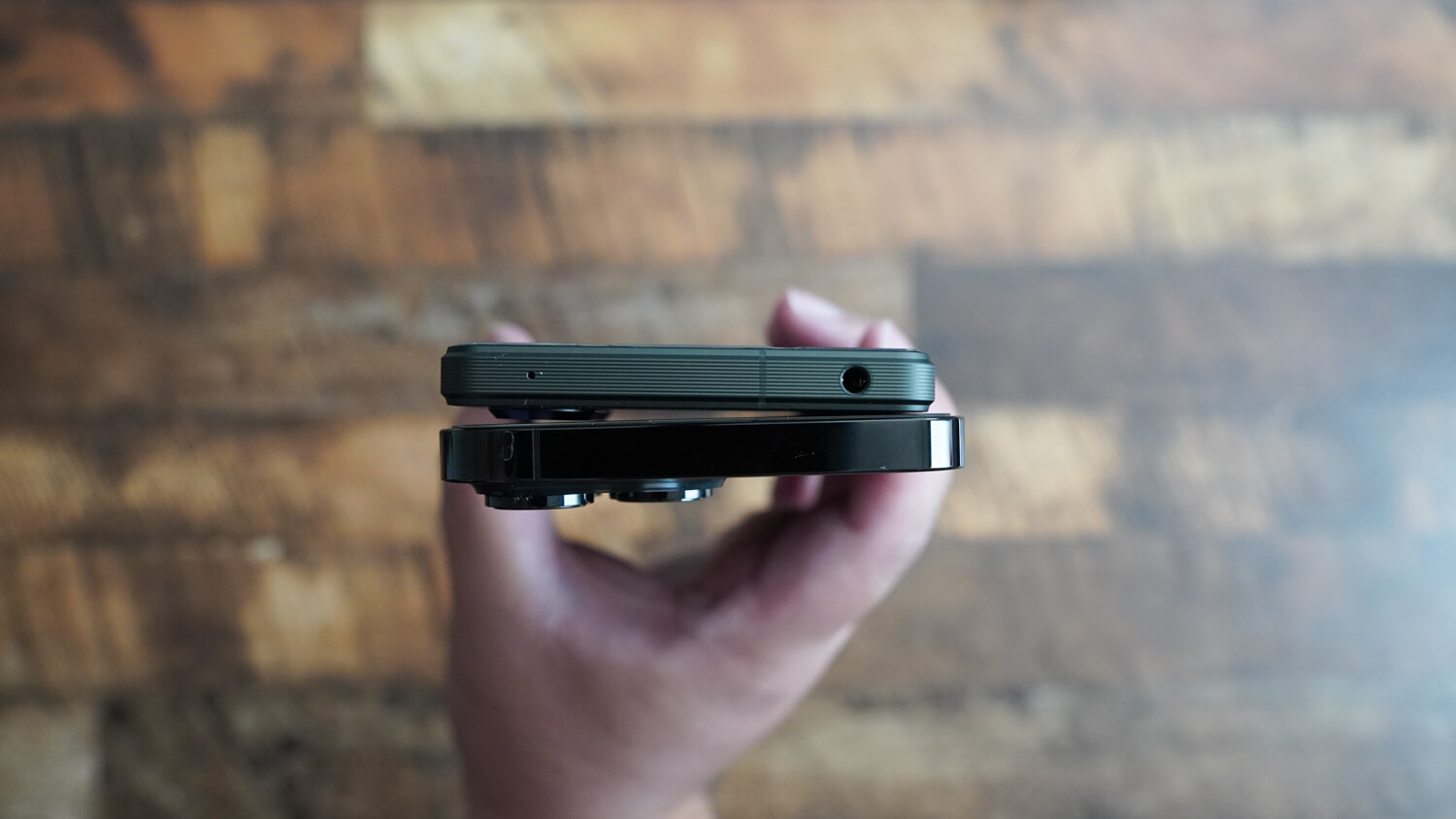 カメラとして使っている時に滑りにくくするための配慮であり同時にデザインの差別化にも繋がる。またデザイン自体の質感は高く安っぽさは感じず両面ともGorilla Victus 2を採用しているため耐久性も優れており持ちやすく軽い。