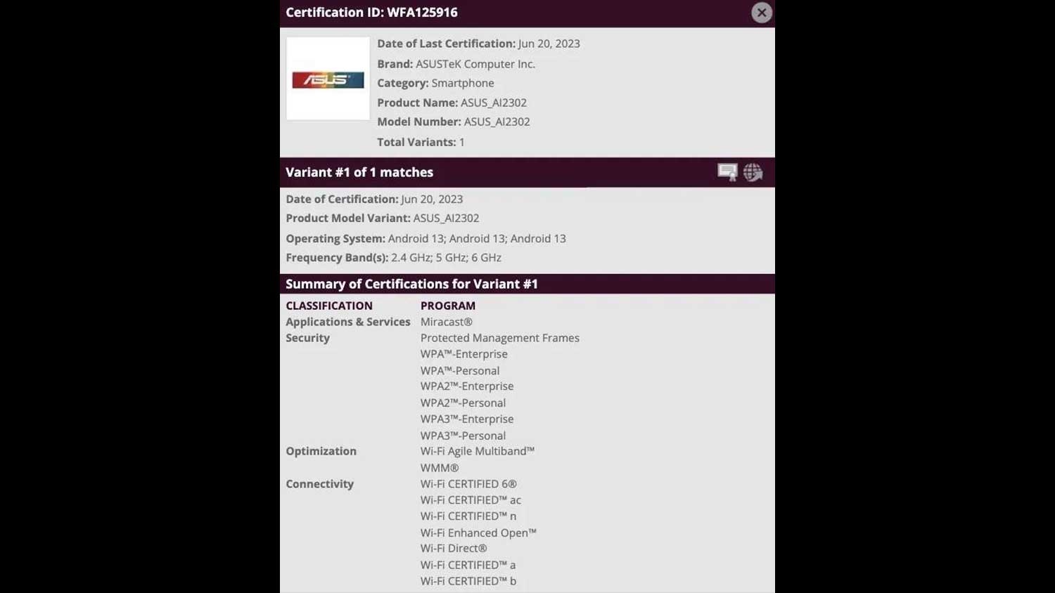 6月29日に正式発表されることが明らかにされているZenfone 10ですが今回Wi-Fi Allianceの認証を通過していることが判明したとしています。認証情報から確認できる内容としては2.4/5/6GHzのWi-Fiに対応していること。