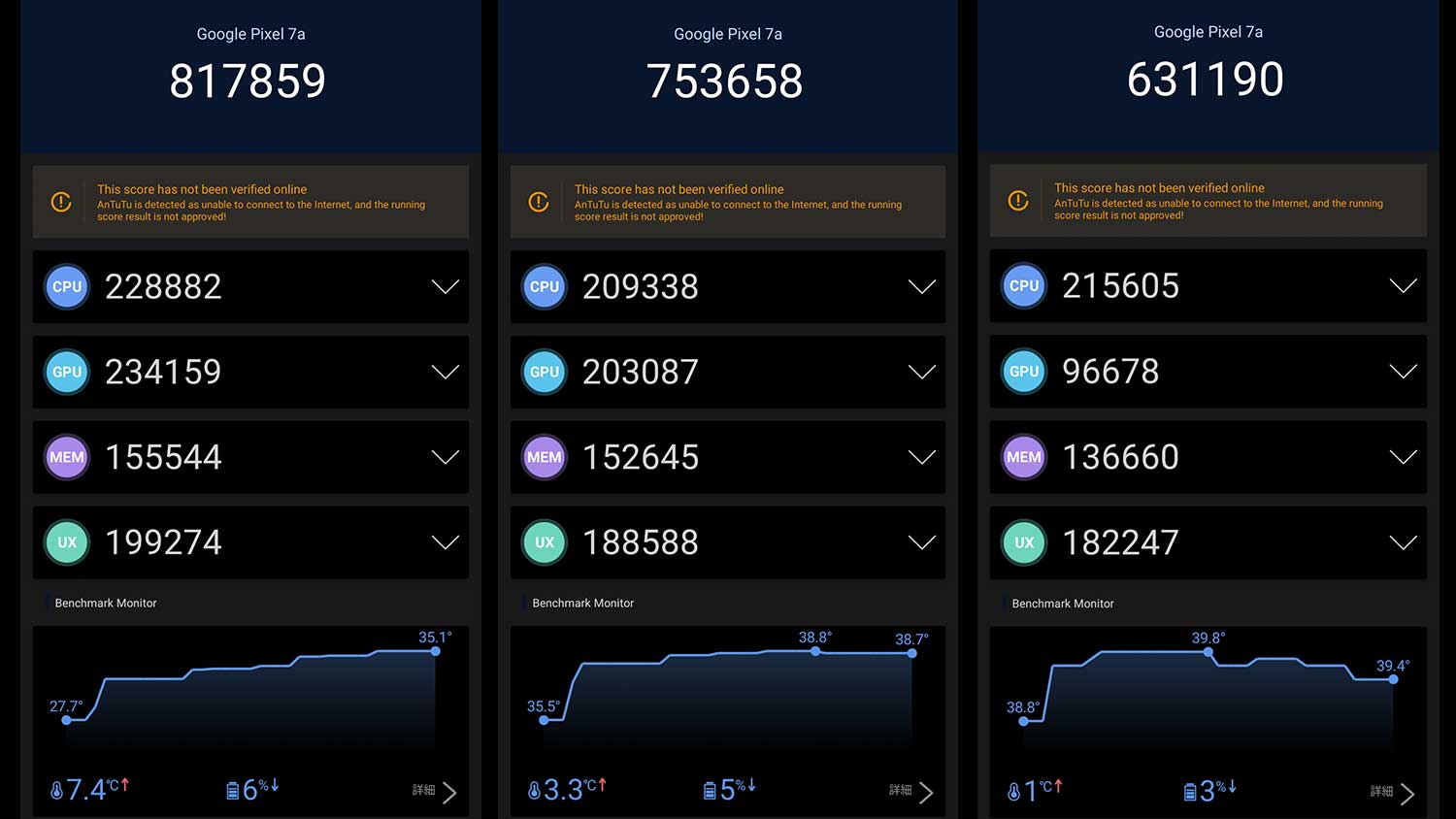 計測終了のタイミングで外部温度を計測してみましたがXperia 10Ⅴは32.6/33.5/34.0度。一方でPixel 7aは34.6/36.1/36.3度と内部温度も外部温度も高く持ってもちょっと熱い。