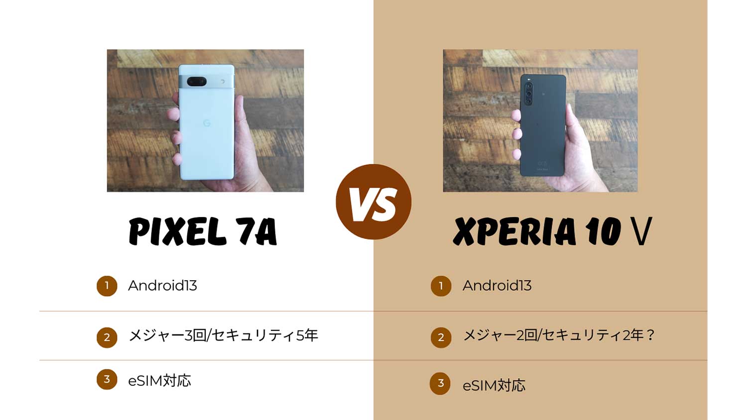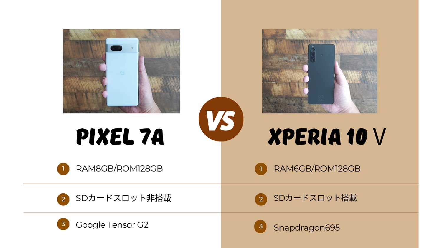 スペック的にはPixel 7aの方が強いためコスパが良いと言われますが一般層が何を求めるか次第。電池持ちや持ちやすさならXperia 10ⅤですしオールマイティさであればPixel 7aだと思います。