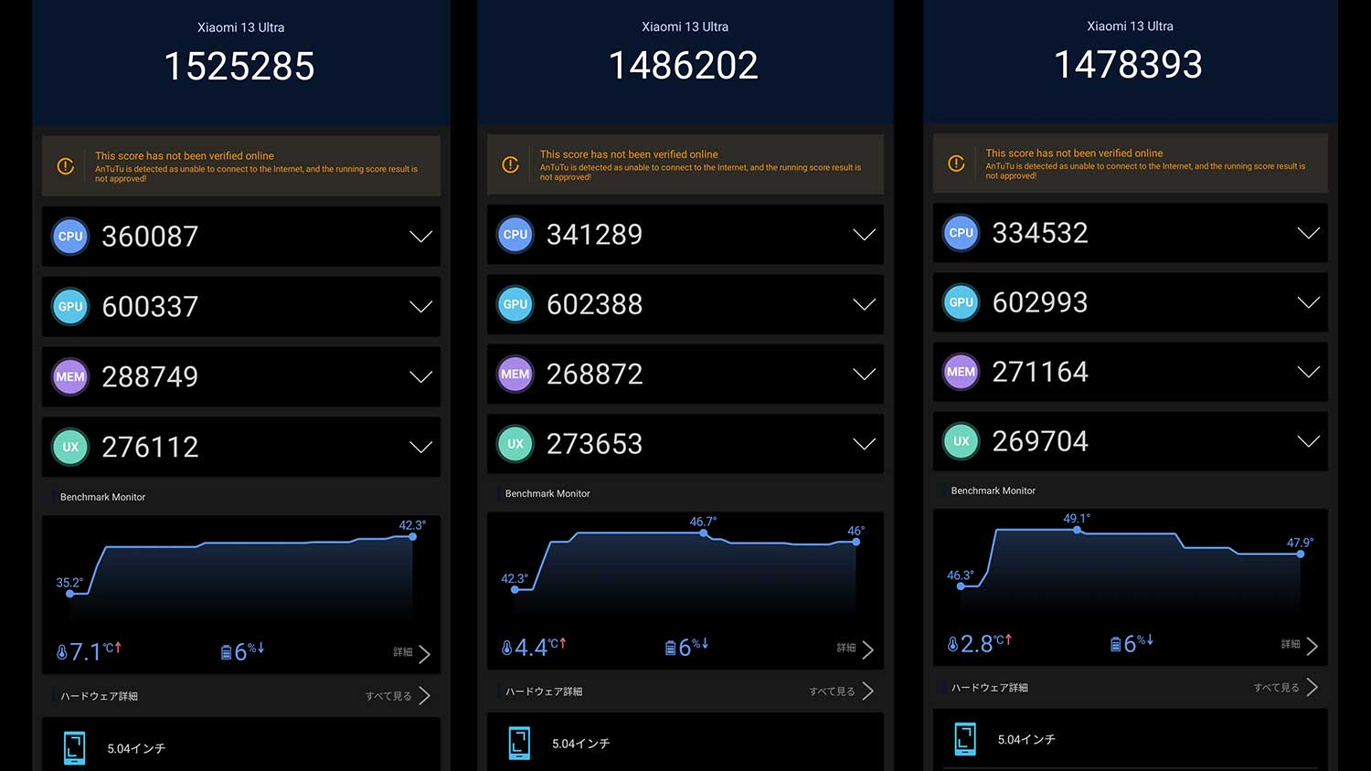 スコアで見れば150万点前後とかなり安定している印象ですが1回目の時点で内部温度が40度に。結果3回目では49度まで上がったことを考えると他の機種と比較しても内部温度がかなり上がりやすい。