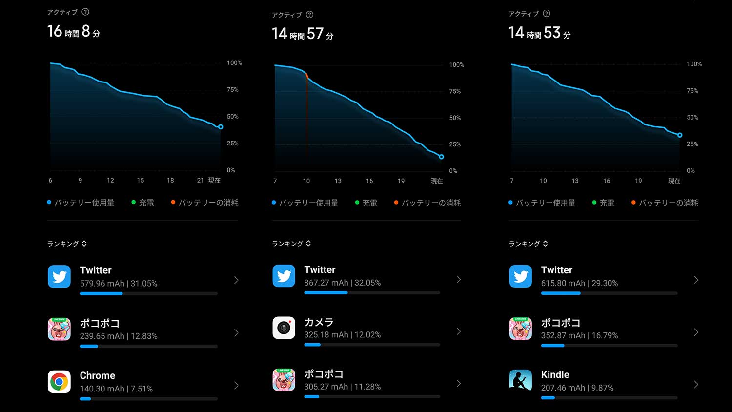 自分の使い方だと寝る前の電池残量は40%以下のことが多くカメラをちょっと使った日は30%以下になることも多々ある。この前は久しぶりに電池残量が一桁になったので自分の使い方で見れば悪く感じてしまいます。