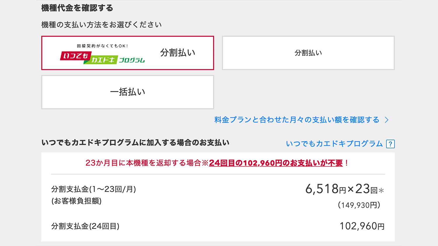 そしていつでもカエドキプログラムを利用した場合は2年で返却する場合は月6518円で24回目の支払いのタイミングで端末を一定の条件を満たした状態で返却することで残債が免除なので14万9930円で使えたことになります。