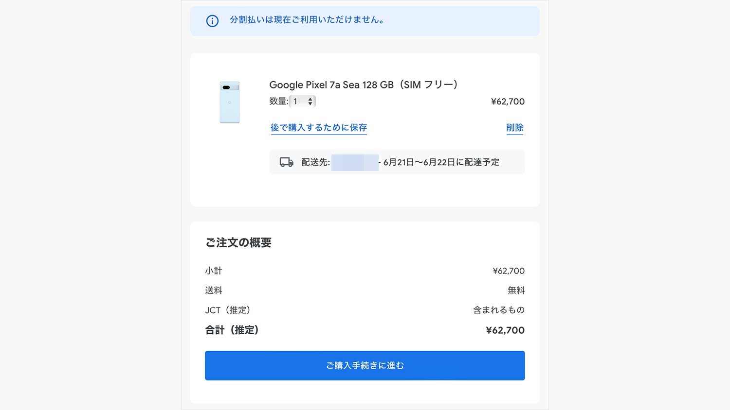 Google Pixel Tabletの発売やGoogle Pixel Foldの予約開始直前の6月中旬頃からGoogle Storedでは分割支払いが出来ない状況になっています。以前は12回の分割払いで一回あたりの支払い金額が製品ページでも表示されていましたが今は表示されていません。