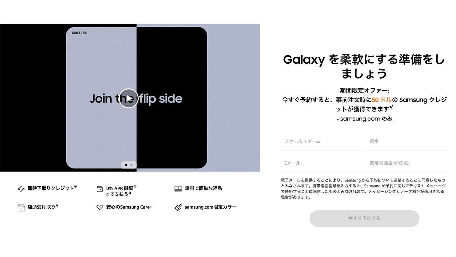そして今回の情報によると米SamsungがGalaxy Z Fold 5とGalaxy Z Flip 5の事前予約を開始したとしています。上記の画像からも今予約すると本予約の時に使える$50分のSamsungクレジットが貰えることを確認できます。