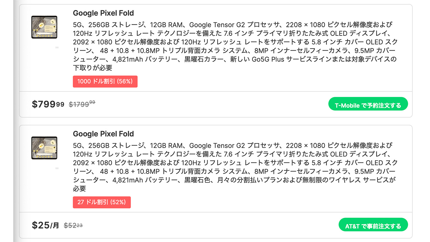 今回T-MobileにおけるPixel Foldの割引条件に言及しており、Go 5G Plus プランを契約するか対象の下取り機種を出す必要性がありますが$1000の値引きになることを確認することができます。