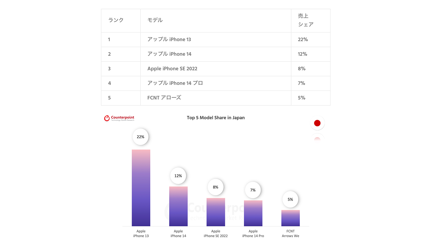今回海外の市場調査会社が2023年4月の売れ筋スマートフォンランキングを公開していることが判明しました。上記の画像からも日本においてはiPhone 13が市場シェア22%と圧倒的な1位であることを確認することができます。